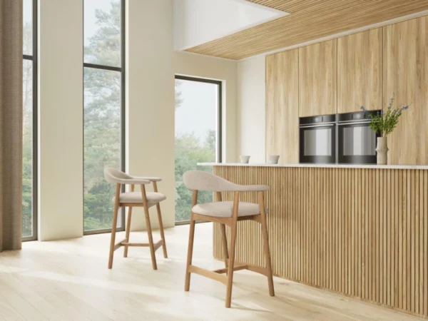 Barska stolica Addimio izrađena je od nauljenog, punog hrastovog drveta. Stabilna baza i savršeno profilirani naslon jamče udobnost sjedenja. Zanimljiva tekstura tkanine s vrlo gustim tkanjem stvara skladnu kombinaciju s prirodnim drvenim vlaknima nogu.