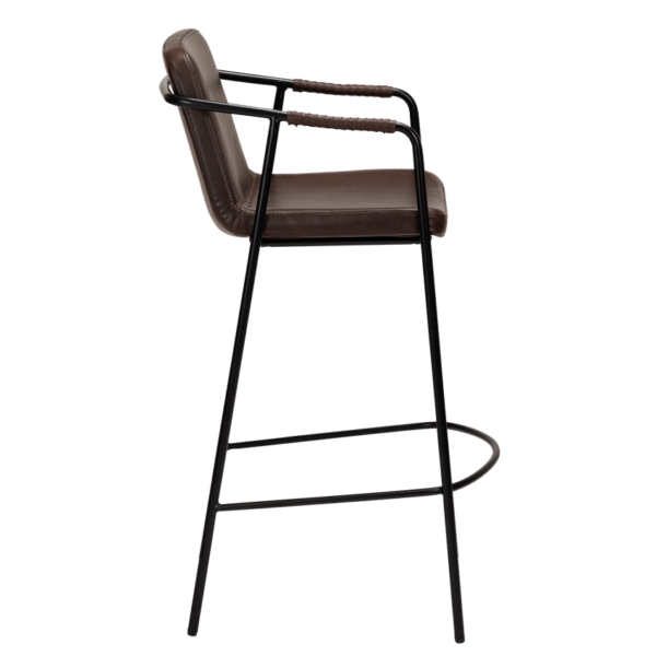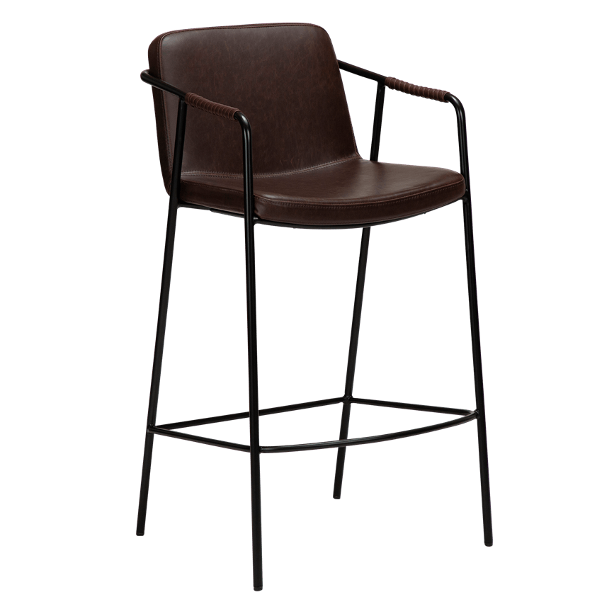 Ova polubarska stolica ističe se tankim metalnim nogama koje se protežu u naslon za ruke. Umjetna koža vintage crne boje obavija naslone za ruke kao dekorativni detalj, podižući dizajn na višu razinu. Dizajn kolekcije Boto potpisuje tvrtka By Georgsen, a kolekcija se sastoji od blagovaonskih i polubarskih stolica te fotelja.