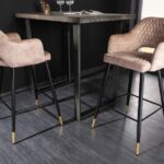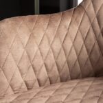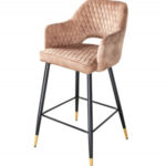 Barska stolica sa sjedištem baršunastoga tkanja u sivoj boji te metalnim nogama sa zlatnim kapicama. Naslon i sjedalo upotpunjeni su ukrasnim prošivima s uzorkom rombića, a otvor u naslonu omogućit će zgodnije pomicanje stolice.
