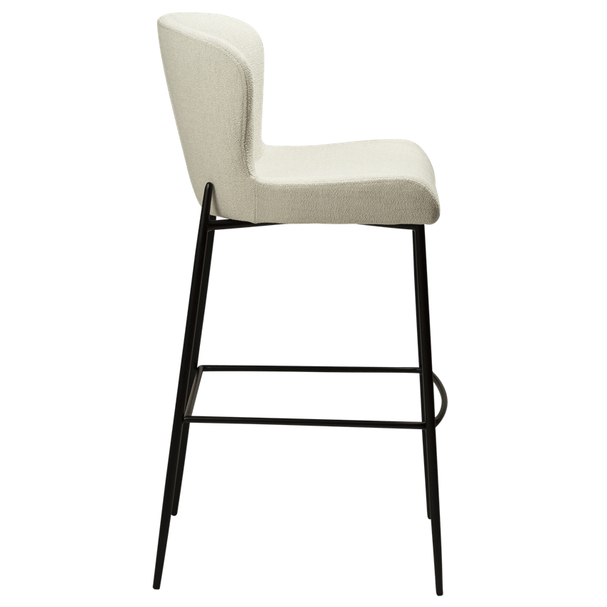 Ova barska stolica zrači elegancijom s kraljevskim dojmom mekano oblikovanog sjedala izrađenog od boucle tkanine bež boje te vitkih metalnih nogu crne boje.