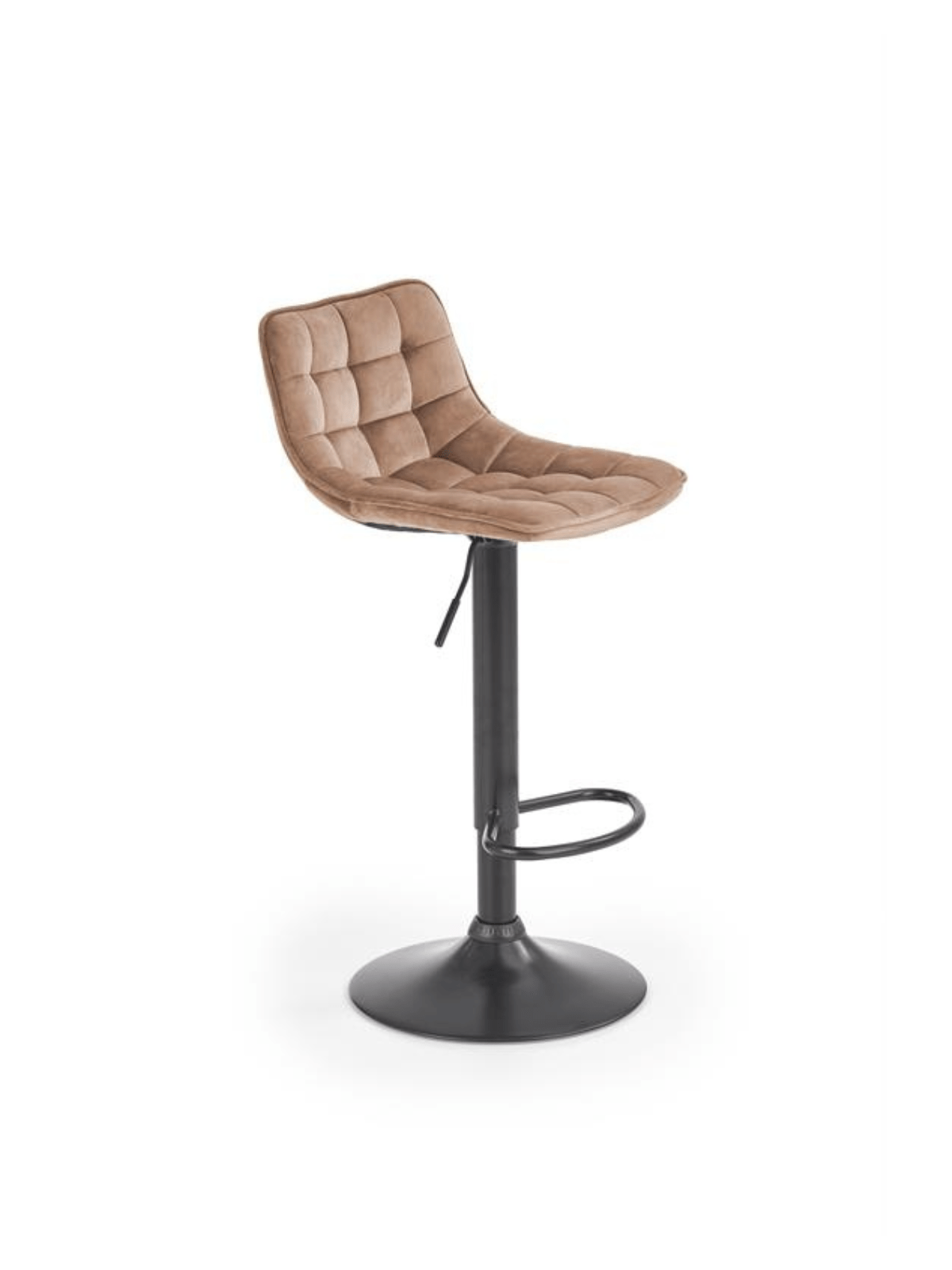 Barska stolica ugodne tkanine s prošivima i crnim rotirajućim postoljem pristajat će u interijere i ugostiteljske objekte.