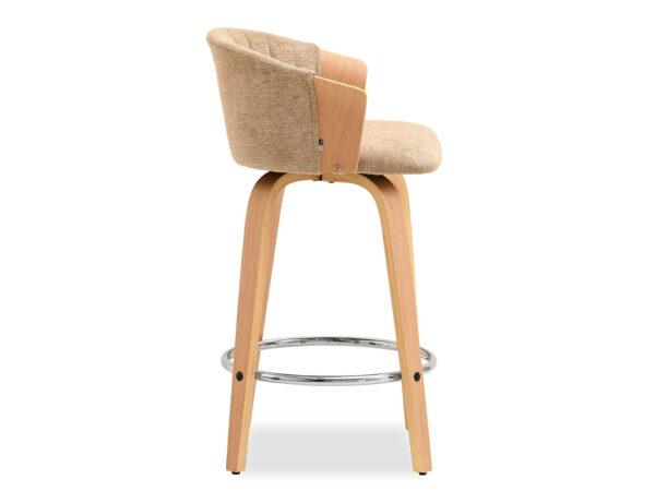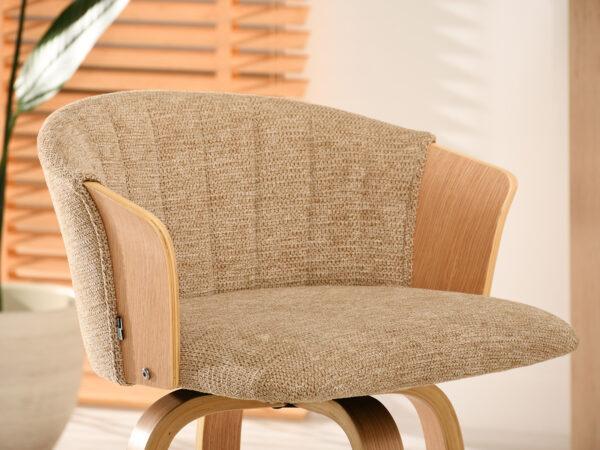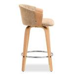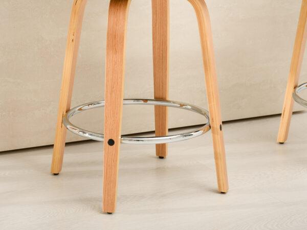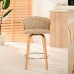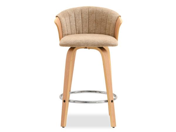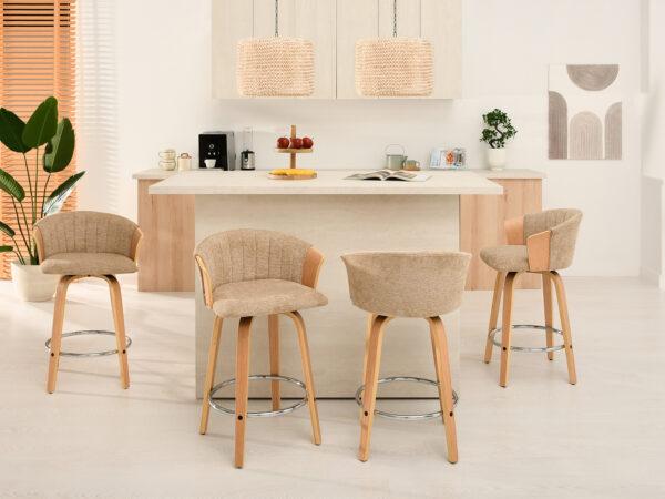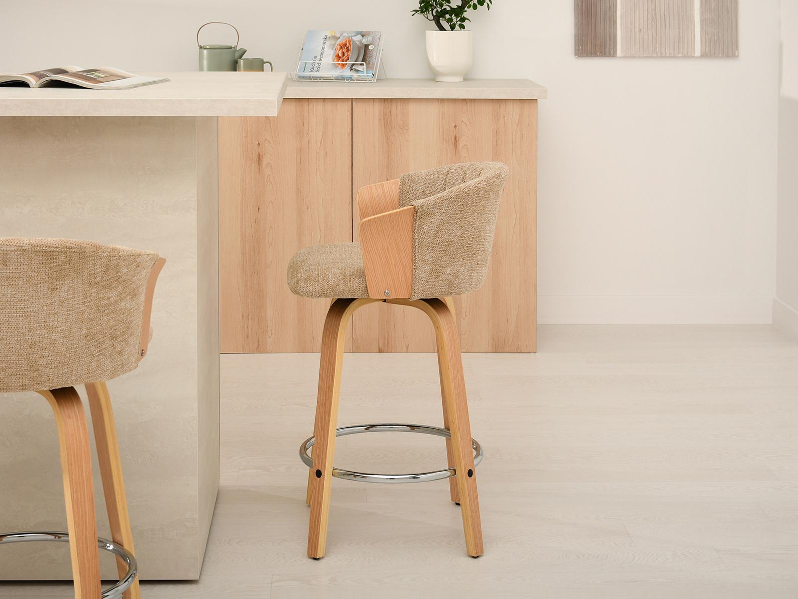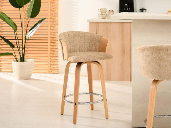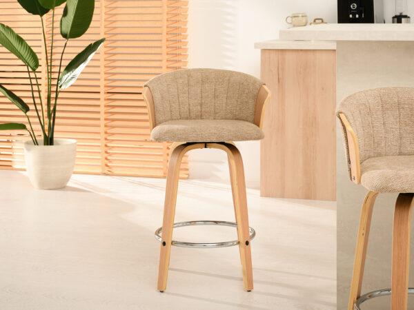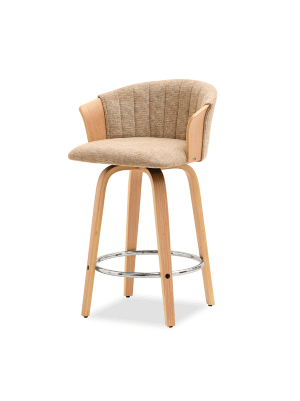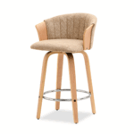 Polubarska stolica Kiran jedinstven je dodatak svakoj kuhinji. Njena kompaktna veličina čini je savršenom za manje prostore, poput kutaka za doručak ili malih čajnih kuhinja. Prirodna drvena završna obrada dodaje toplinu i eleganciju, stvarajući ugodnu atmosferu. Ova okretna stolica također je izvrstan izbor za otvorene dnevne prostore gdje se kuhinja spaja s dnevnim boravkom, skladno kombinirajući različita funkcionalna područja.