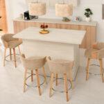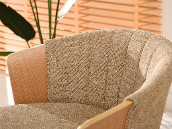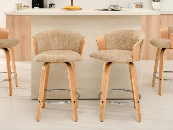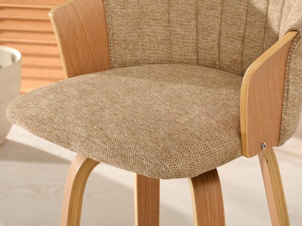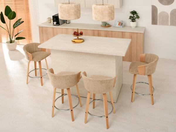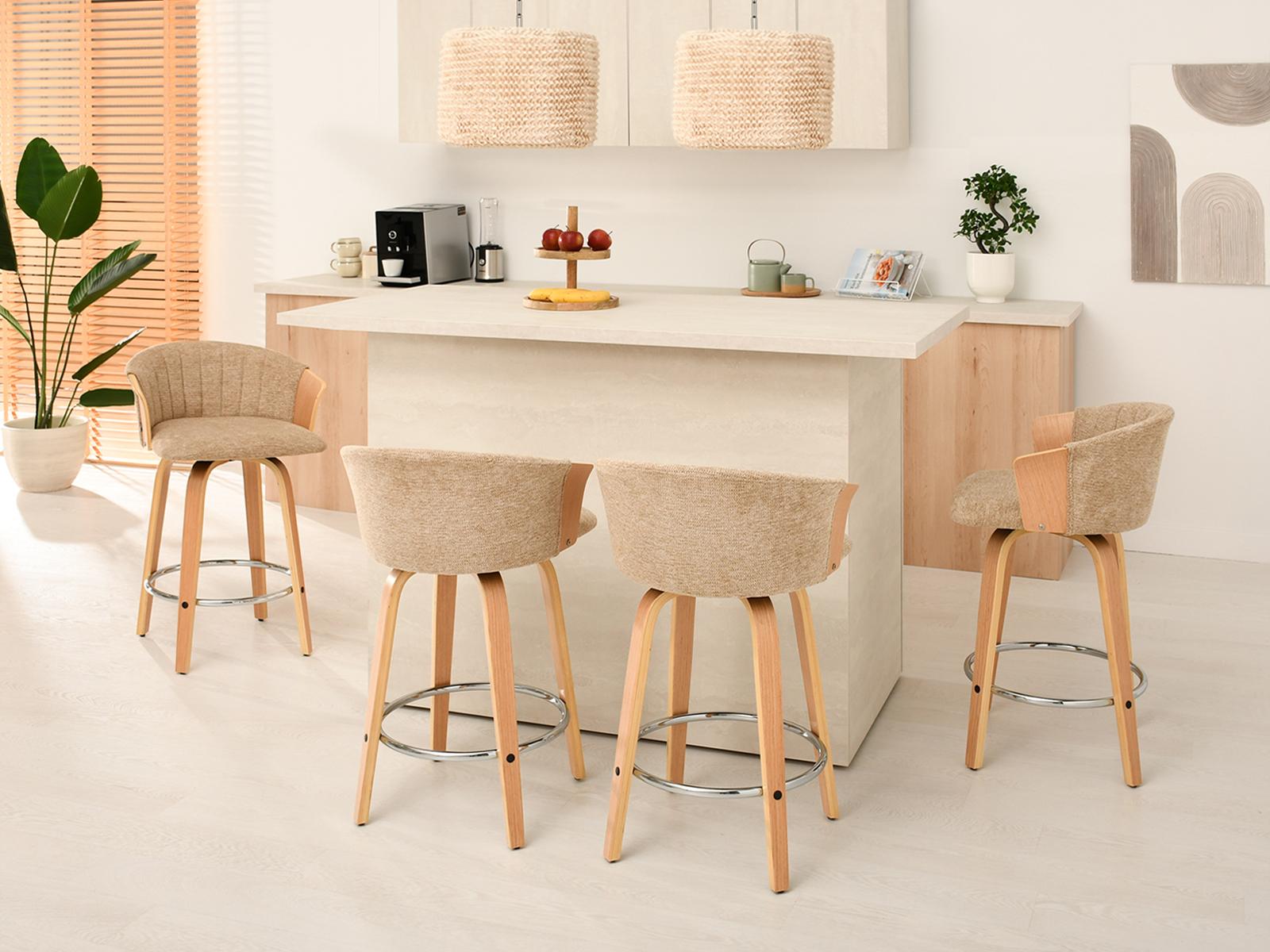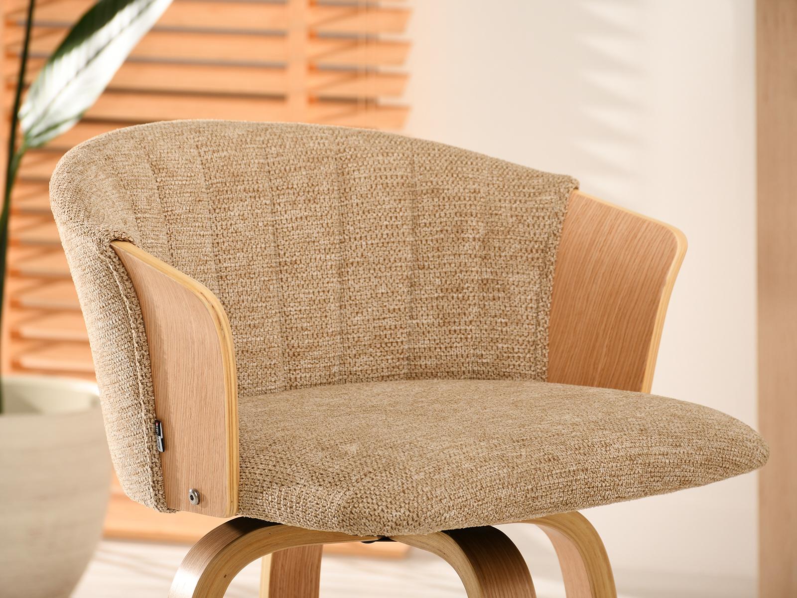 Polubarska stolica Kiran jedinstven je dodatak svakoj kuhinji. Njena kompaktna veličina čini je savršenom za manje prostore, poput kutaka za doručak ili malih čajnih kuhinja. Prirodna drvena završna obrada dodaje toplinu i eleganciju, stvarajući ugodnu atmosferu. Ova okretna stolica također je izvrstan izbor za otvorene dnevne prostore gdje se kuhinja spaja s dnevnim boravkom, skladno kombinirajući različita funkcionalna područja.
