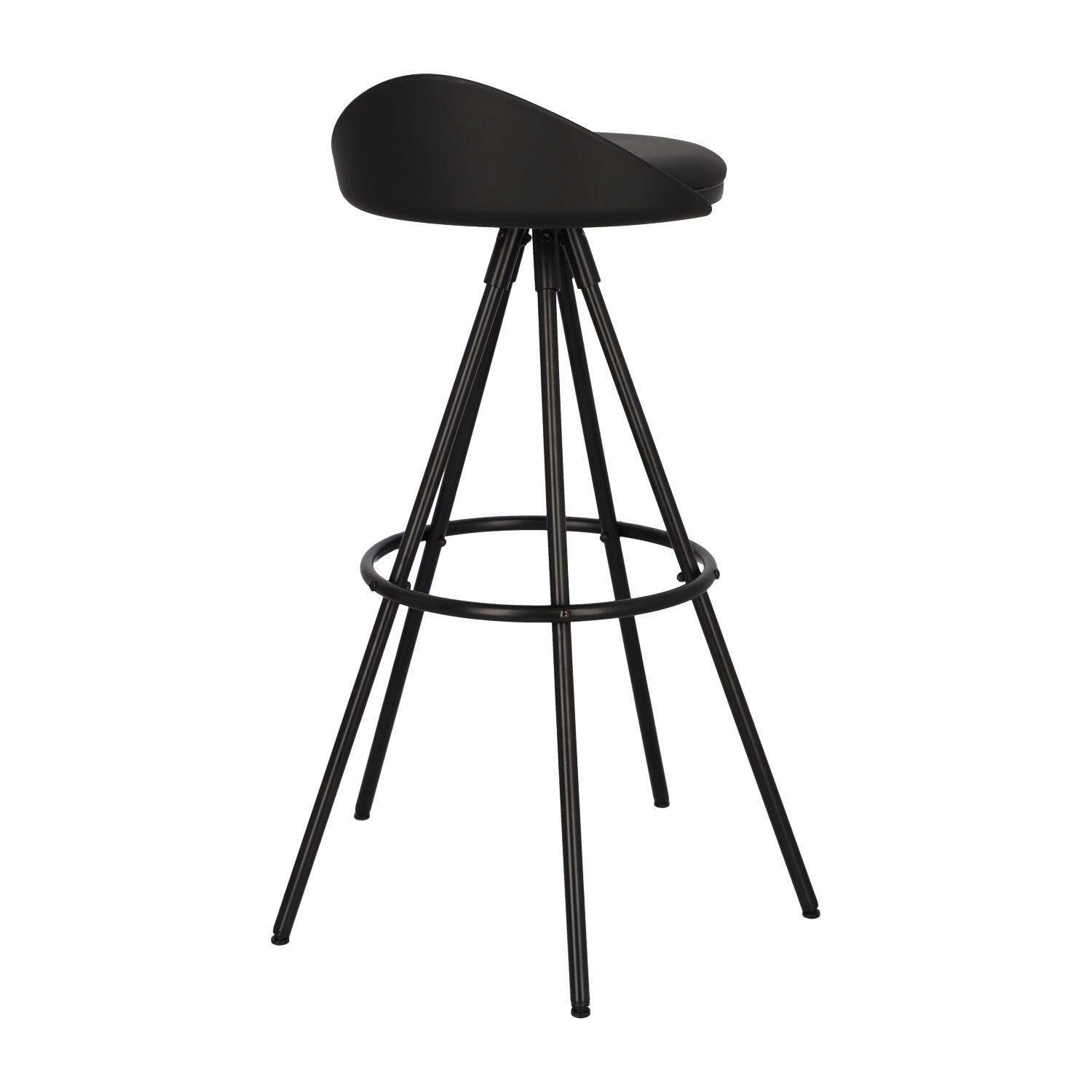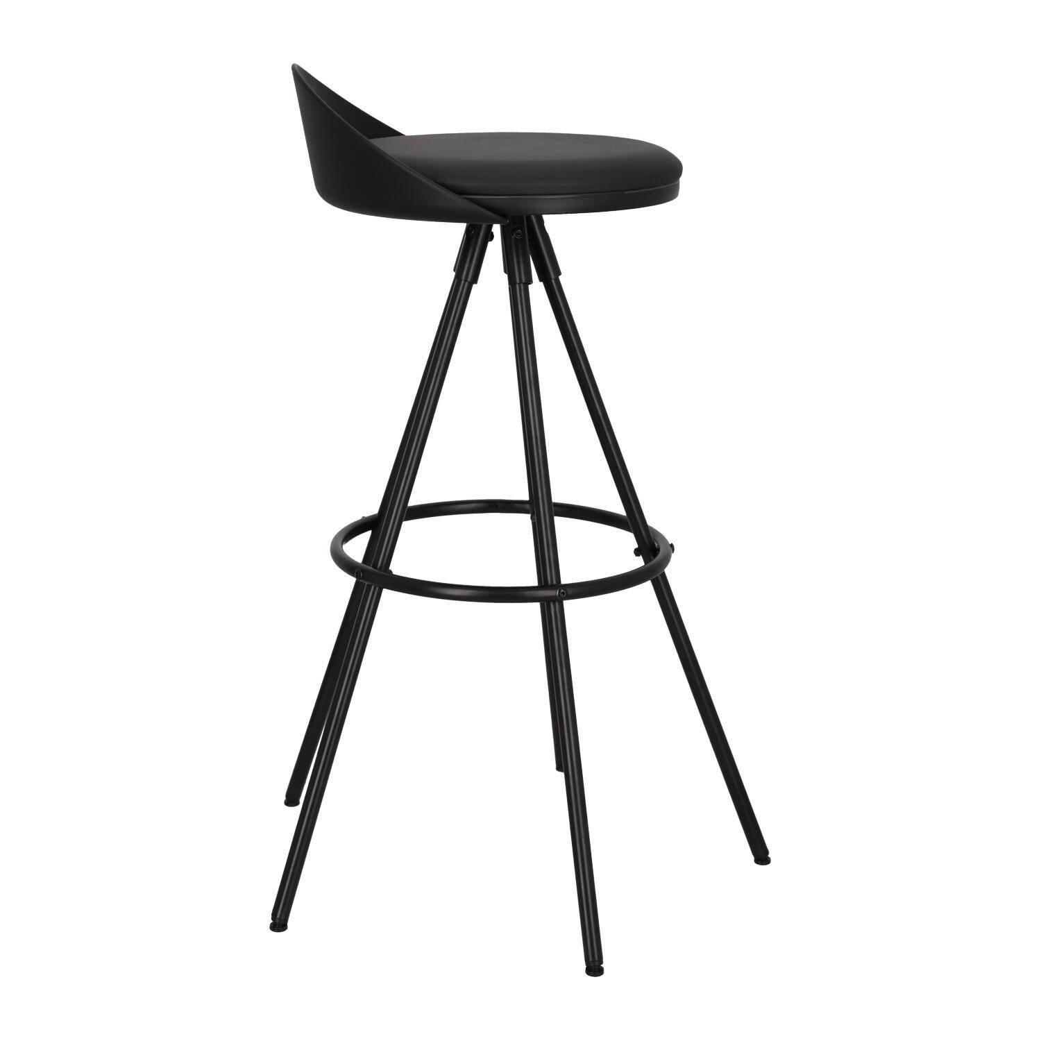 Moderna, crna barska stolica s mekim sjedištem najtraženiji je komad namještaja za interijere u stilu potkrovlja. Metalna baza sastavljena od 5 nogu koje se spajaju na jednom mjestu u središnjem dijelu sjedalice jamči udobnost i stabilnost. Sjedalo okruglog oblika završeno je mekim jastukom ispunjenim pjenom. Tkanina koja se koristi za presvlaku jastuka je ekološka koža s polumat dubokom crnom završnicom. Jastuk se ne može skinuti, a zahvaljujući završnoj obradi od eko kože, lako se čisti. Zanimljiv element stolice je i niski plastični naslon.