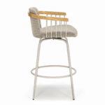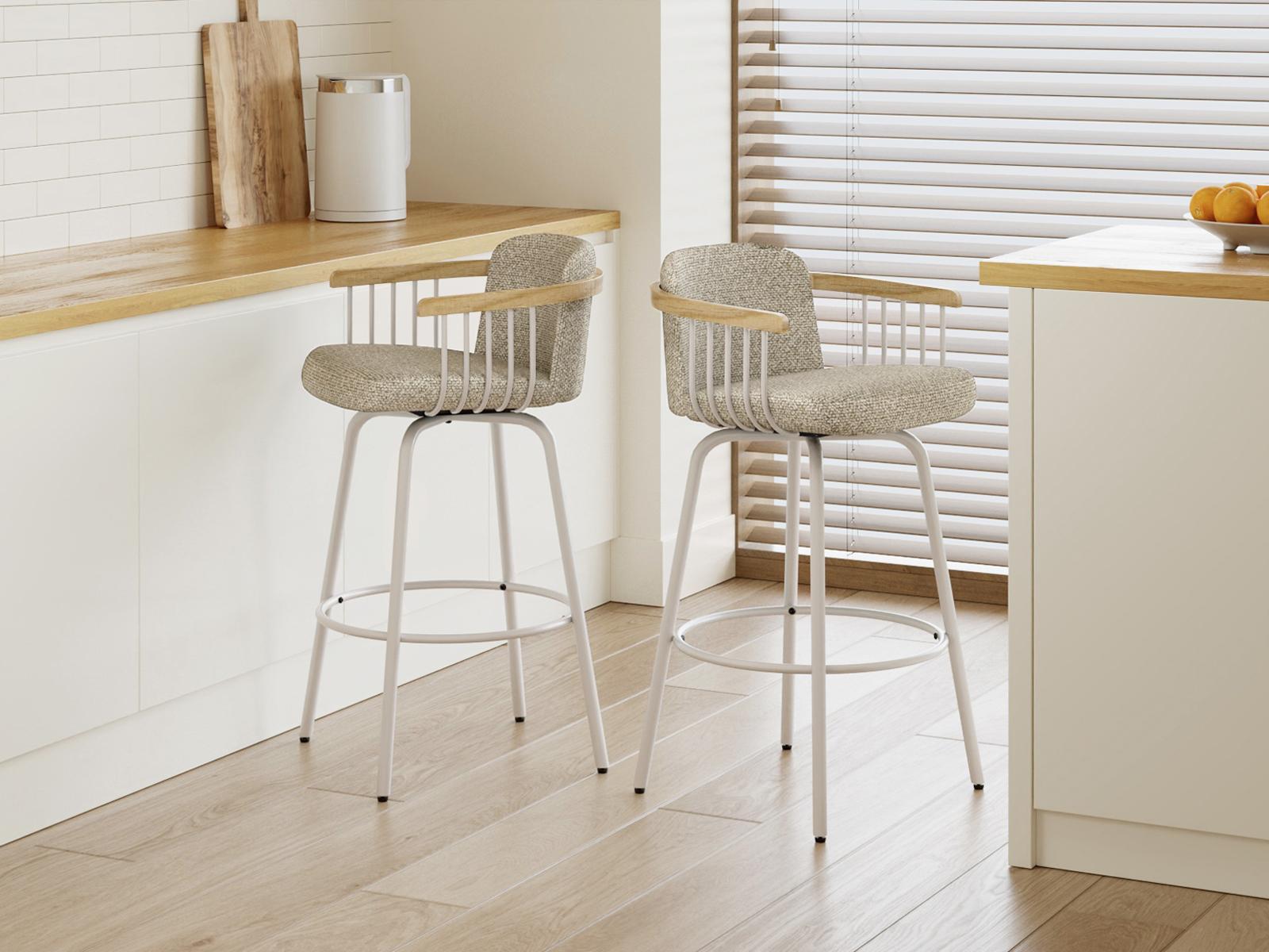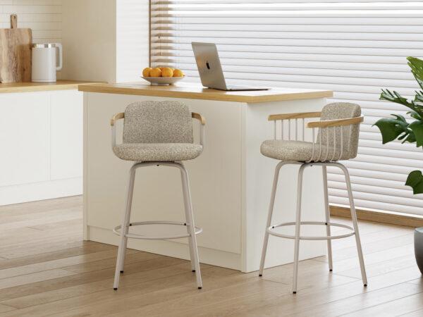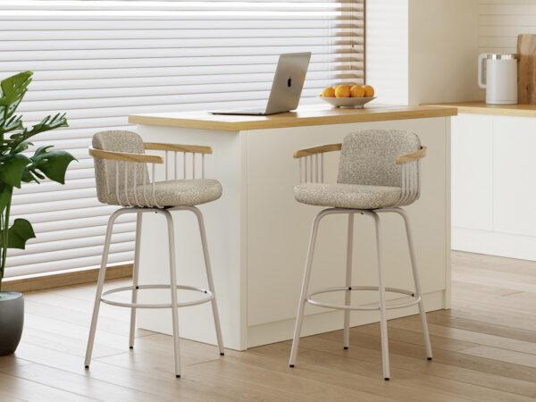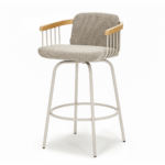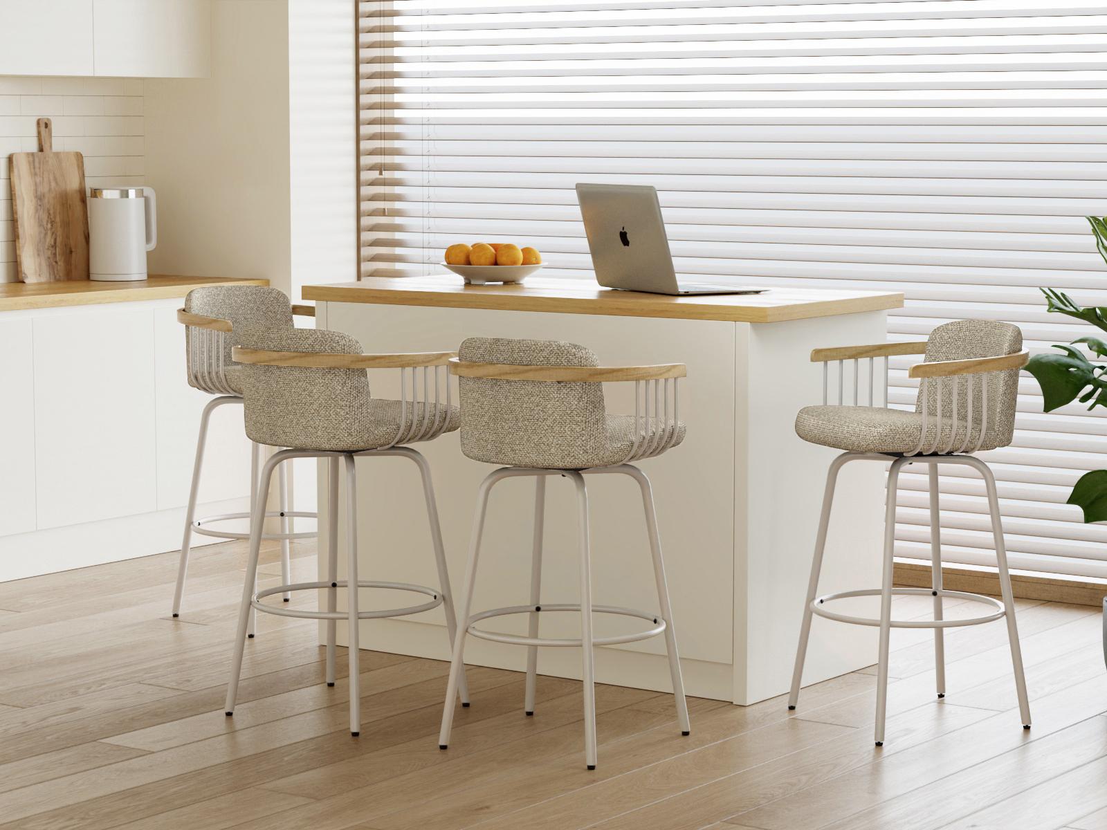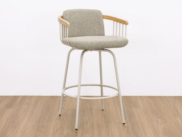 Odabirom barske stolice Ribs ulažete u udobnost, izdržljivost i moderan dizajn. Ovaj model kombinira praktične značajke, poput okretnog sjedala i minimalističkih, otvorenih rukonaslona, s estetikom prirodnog hrastovog drva i elegantne tkanine.