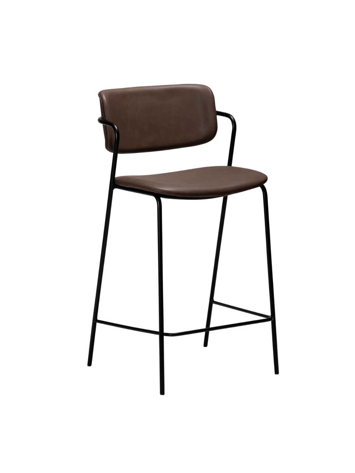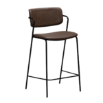 Polubarska stolica s tankim metalnim nogama crne boje izgleda gotovo lebdeće. Inspirirana klasičnim stolicama ’50-ih, stolica kombinira čiste linije s mekim izgledom, što joj daje suvremeni dojam. Naslon i sjedište presvučeni su eko kožom vintage crne boje.