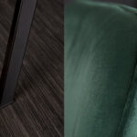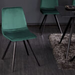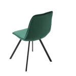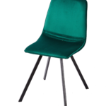 Blagovaonska stolica retro dizajna presvučena je baršunastom tkaninom smaragdno zelene boje. Postolje je crne boje te je izrađeno od metala.
