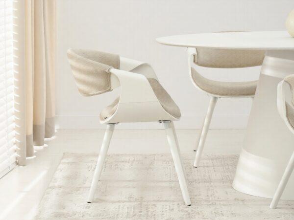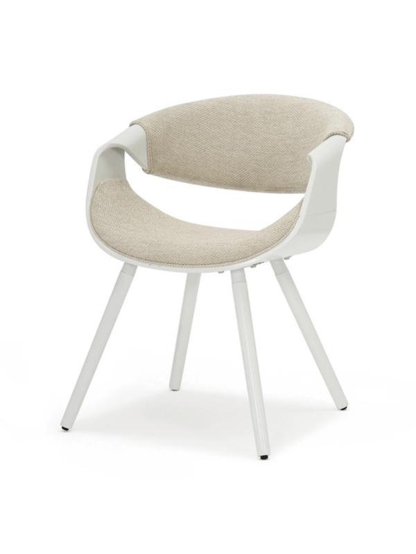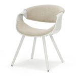 Blagovaonska stolica Betty izrađena je od visokokvalitetnog savijenog drva što osigurava izdržljivost i strukturnu stabilnost. Presvlaka je izrađena od mekane, ugodne na dodir bež tkanine i ispunjena je pjenom, što osigurava udobno i podstavljeno sjedalo.