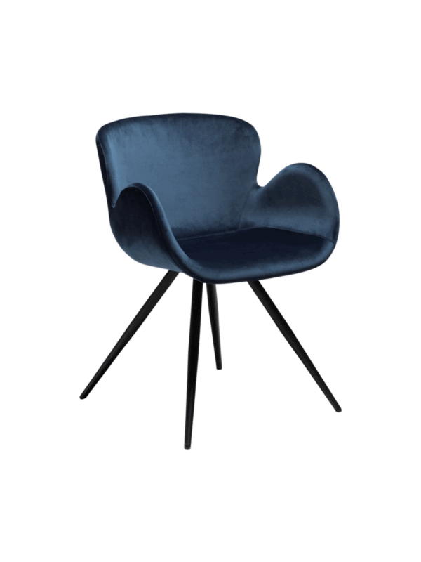 Ova elegantna stolica ističe se svojim mekanim sjedištem i naslon presvučenim baršunom tamno plave boje, pozivajući na uživanje u dugim razgovorima za blagovaonskim stolom.