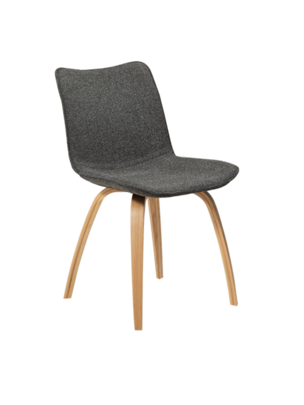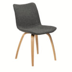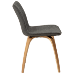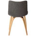 Ova stolica odiše živahnošću svojim zavijenim naslonom i sjedištem presvučenim boucle tkaninom sive boje. Njezine furnirane noge drva hrasta dodatno ističu zanimljiv dizajn.