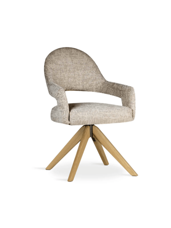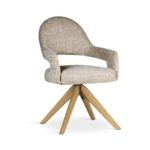 S konturiranim naslonom i drvenom okretnom bazom, blagovaonska stolica Ivona osigurava ergonomsku udobnost i slobodu kretanja. Elegantan izrez na naslonu i pedantna završna obrada dodaju karakter interijeru, a zahvaljujući mogućnosti personalizacije, model možete u potpunosti uskladiti s vašim individualnim stilom interijera, kombinirajući funkcionalnost s estetikom.