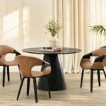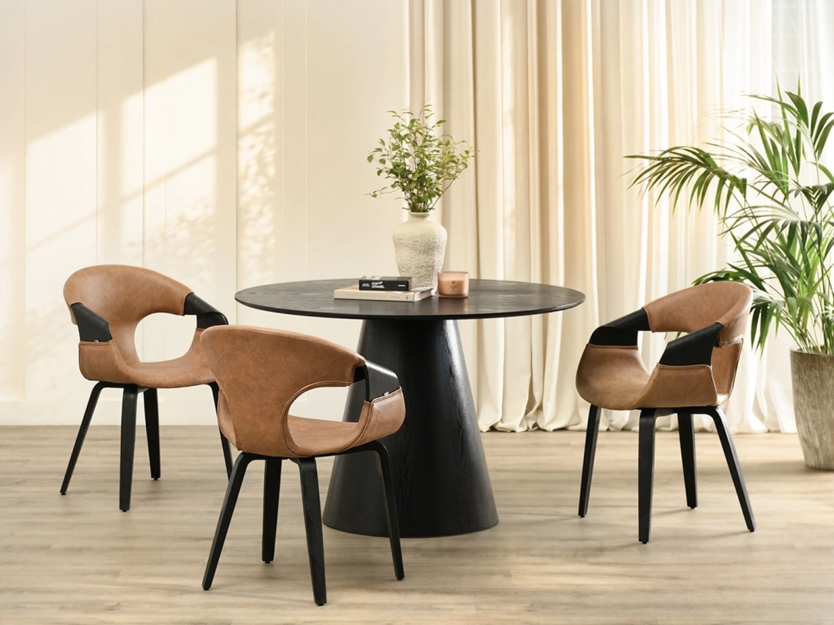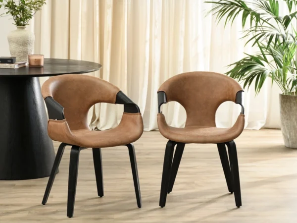 Blagovaonska stolica Linus izrađena je od punog savijenog drva, stvarajući stabilnu i izdržljivu bazu. Presvlaka od tkanine s efektom kože u vintage stilu nije samo estetski ugodna, već je mekana i udobna.