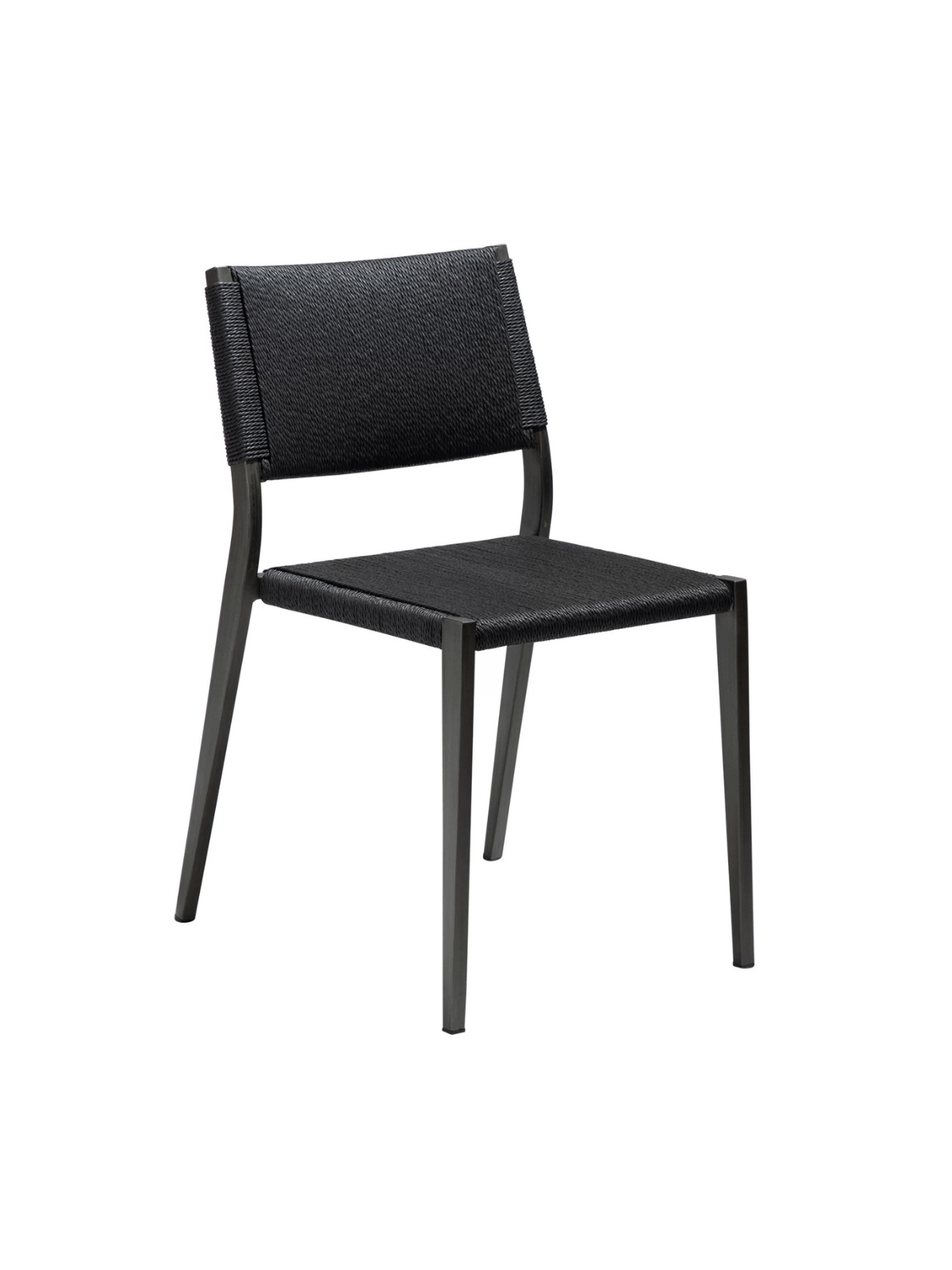 Metalni okvir tamno sive boje ukrašen je ručno pletenim 3-slojnim vlaknom crne boje, pružajući stolici jednostavan, linearan izgled koji je podiže na višu razinu.