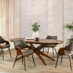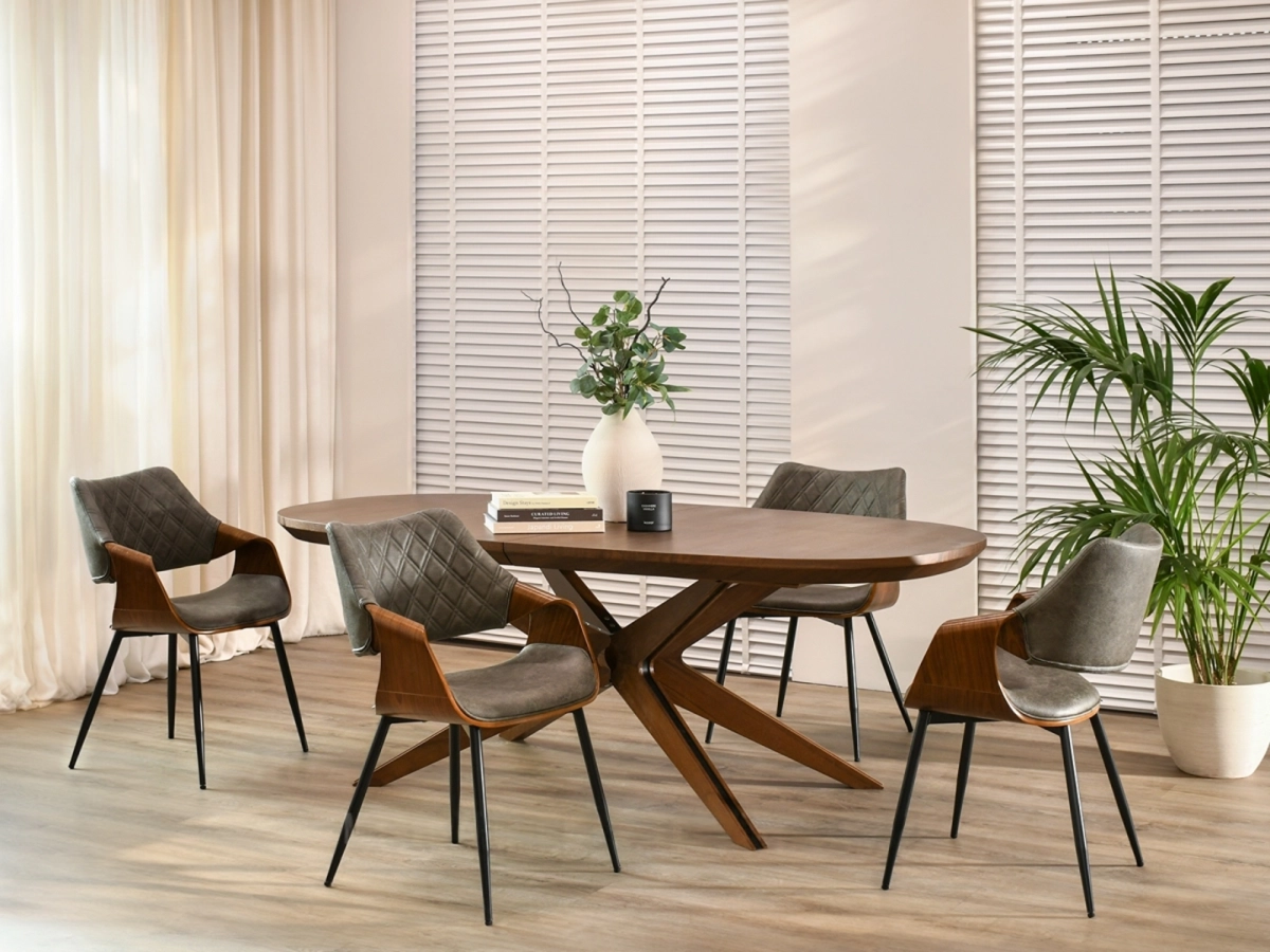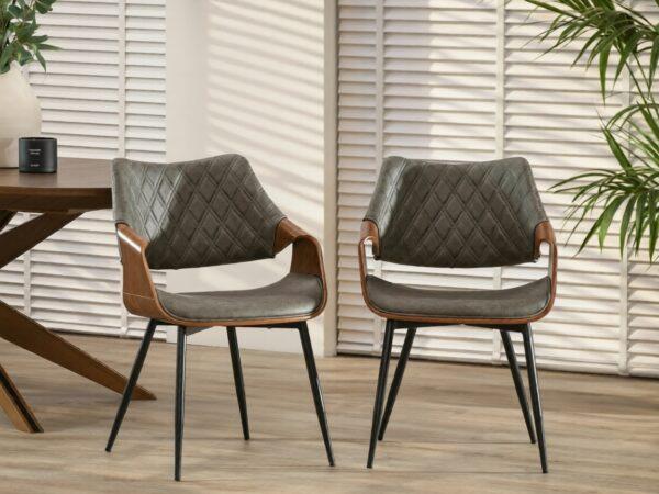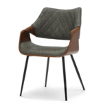 Blagovaonska stolica Lord izrađena je od metala i visokokvalitetnog furnira boje oraha koji joj daje prirodnu toplinu. Ovaj model presvučen je vintage tkaninom koja imitira kožu, ugodna je i mekana na dodir, dok elegantni šavovi i suptilno svjetlucave boje s efektom istrošenosti i suptilnim pukotinama daju elegantan izgled.