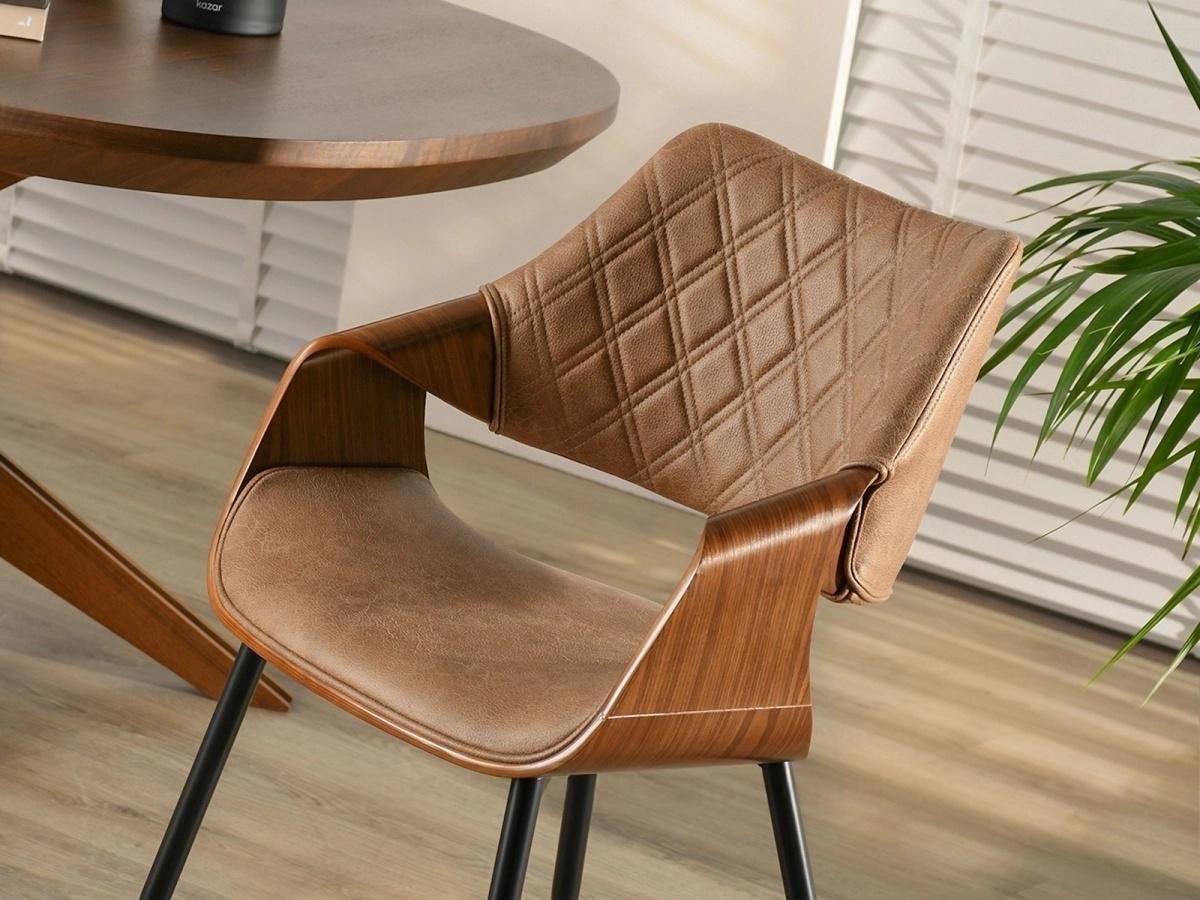 Blagovaonska stolica Lord izrađena je od metala i visokokvalitetnog furnira boje oraha koji joj daje prirodnu toplinu. Ovaj model presvučen je vintage tkaninom koja imitira kožu, ugodna je i mekana na dodir, dok elegantni šavovi i suptilno svjetlucave boje s efektom istrošenosti daju elegantan izgled.