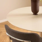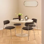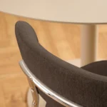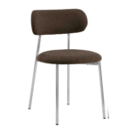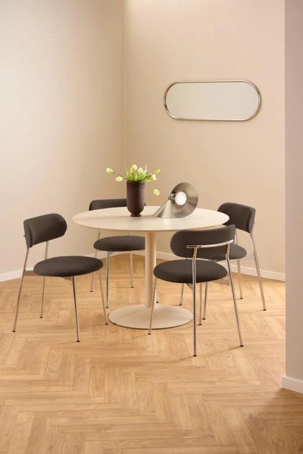 Blagovaonska stolica Lyrica utjelovljuje futurističku estetiku, unoseći element minimalizma u blagovaonicu. Cjevasti okvir i noge izrađeni su od sjajnog kromiranog čelika, a kako bi se naglasila mekša strana dizajna, zaobljeno sjedalo prekriveno je tkaninom sličnom šenilu.