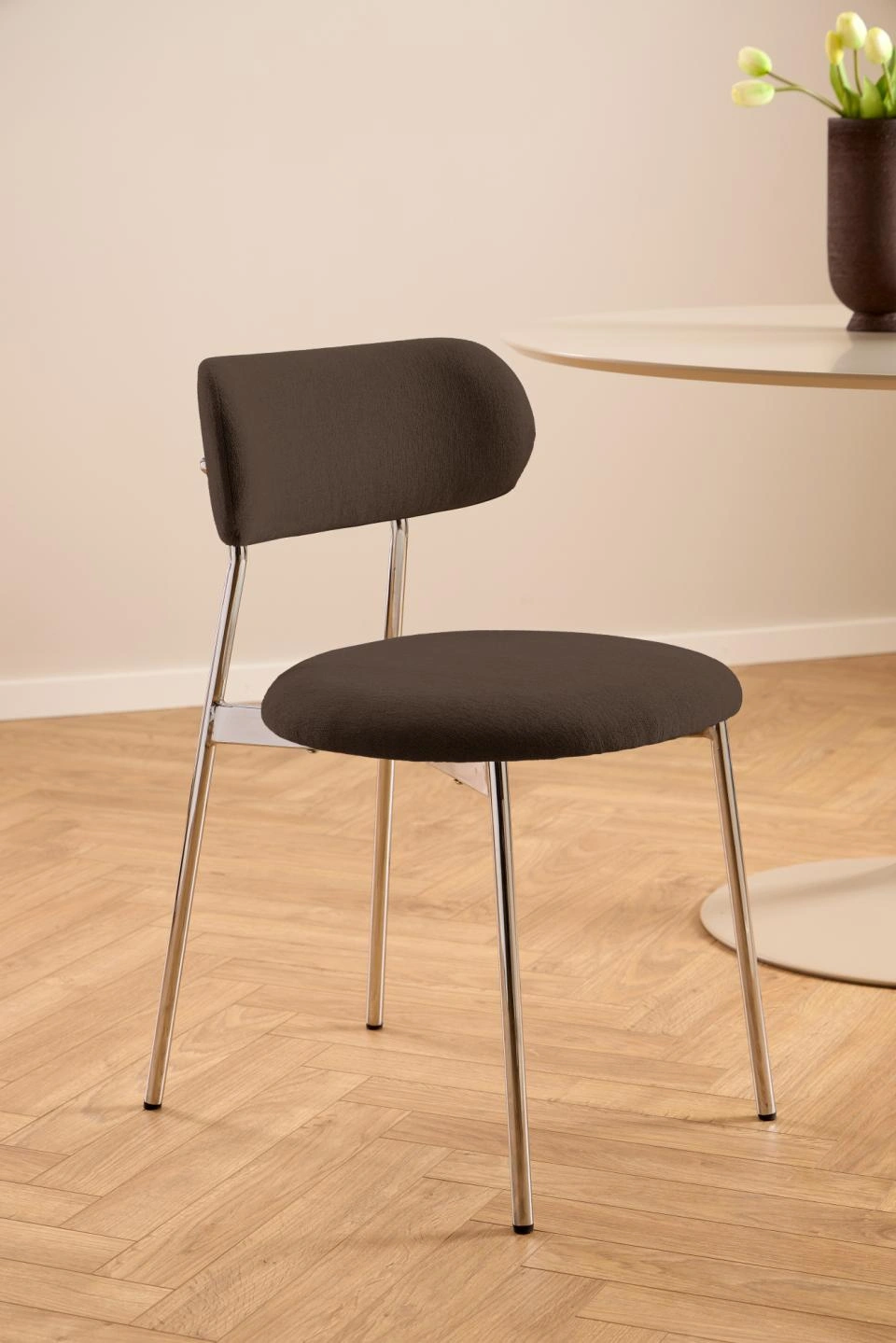 Blagovaonska stolica Lyrica utjelovljuje futurističku estetiku, unoseći element minimalizma u blagovaonicu. Cjevasti okvir i noge izrađeni su od sjajnog kromiranog čelika, a kako bi se naglasila mekša strana dizajna, zaobljeno sjedalo prekriveno je tkaninom sličnom šenilu.