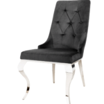Ova barokna stolica ističe se visokokvalitetnom baršunastom navlakom crne boje i elegantnim, sjajnim nogama od kromiranog metala, stvarajući atmosferu koja odiše luksuzom.