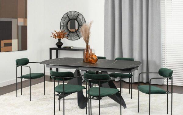 Blagovaonska stolica Odissa naglašene pravilne konstrukcije u crnome metalu idealna je za sve ljubitelje geometrijskoga namještaja, pa i secesije. Stilski obilježena stolica dolazi u više nijansi tapeciranoga naslona i sjedišta.