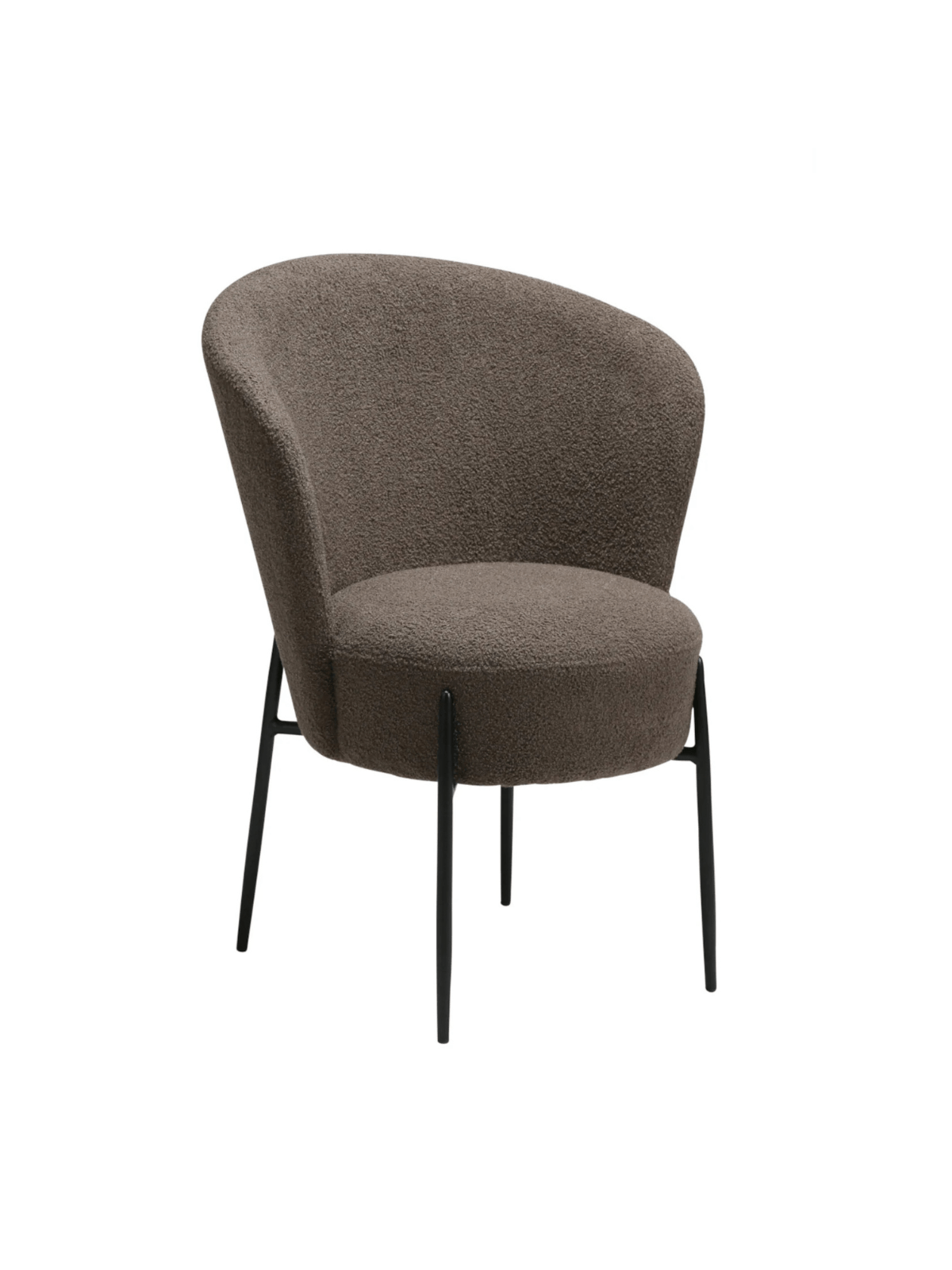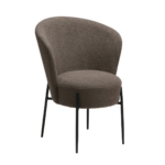 Stolica ima luksuzan izgled s okruglim, mekanim sjedalom i naslonom presvučenim recikliranom boucle tkaninom smeđe boje. Elegantan dizajn stolice ističu crne metalne noge i dodaju dodir sofisticiranosti te podižu cjelokupan dizajn.