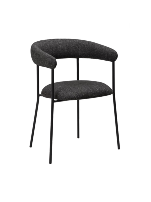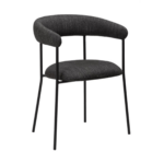 Naslonjač ove stolice je blago zaobljen i nastavlja se na rukonaslone. Naslonjač, kao i sjedalo presvučeni su crnom boucle tkaninom te stoje na crnim metalnim nogama.