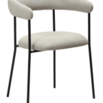 Naslonjač ove stolice je blago zaobljen i nastavlja se na rukonaslone. Naslonjač, kao i sjedalo presvučeni su boucle tkaninom boje kašmira te stoje na crnim metalnim nogama.
