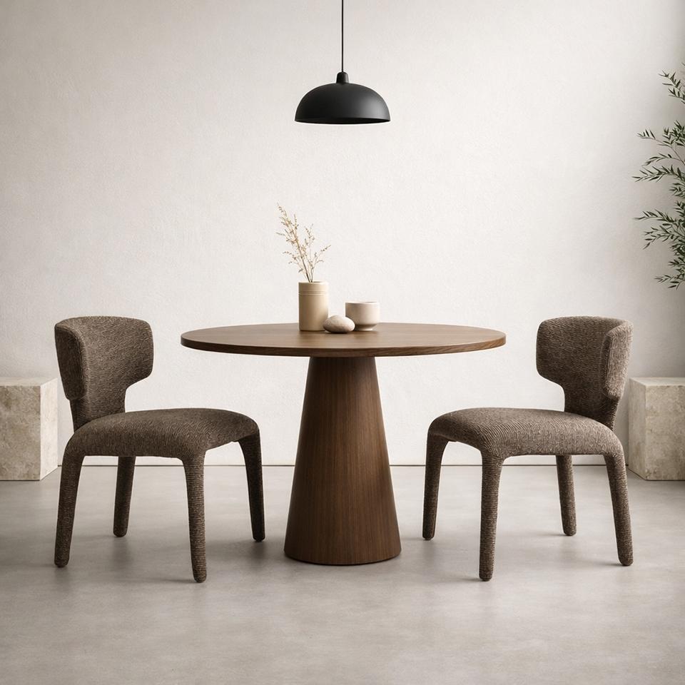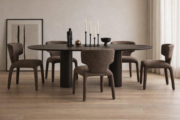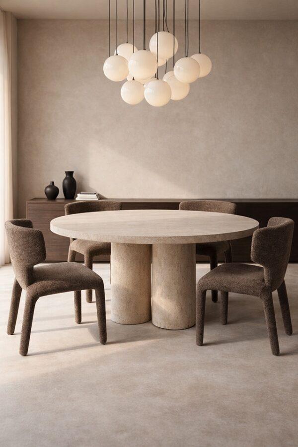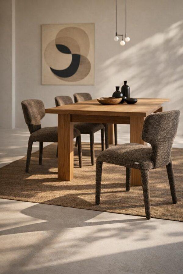 Blagovaonska stolica Puglia dizajnerska je stolica iznimno mekog organskog oblika. Presvlaka od 100% poliestera ima prepoznatljivu strukturiranu površinu koja joj daje moderan karakter. Zaobljene linije i integrirani oblik sjedala i nogu stvaraju skulpturalnu siluetu, dok konstrukcija od metalnog okvira, drva i šperploče osigurava stabilnost i izdržljivost.