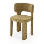 Ravela stolica odiše suvremenom elegancijom i profinjenim dizajnom koji se lako uklapa u različite interijere. Nježne zaobljene linije, udobno tapecirano sjedište i dekorativna tkanina u svijetloj maslinasto zelenoj nijansi stvaraju skladan spoj estetike i funkcionalnosti, idealan za blagovaonicu, dnevni boravak ili elegantan poslovni prostor.