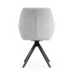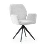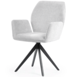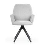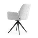 Udobna stolica s crnim, čvrstim metalnim nogama ima široko sjedalo prekriveno udobnim naslonima za ruke koji rasterećuju vaše ruke tijekom obroka ili rada. Okretna noga povećava udobnost korištenja i može razveseliti i mlađe i starije ukućane.
