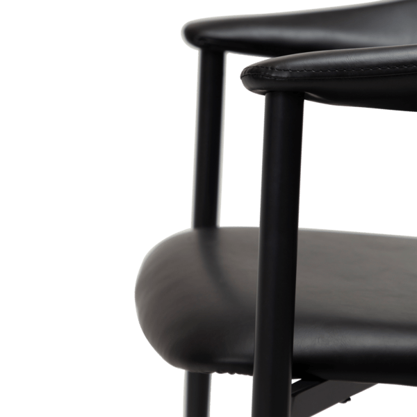 Stolica s naslonom koji se proteže u udobne rukonaslone ima dekorativne šavove i udobno sjedište. Presvučena je eko kožom vintage crne boje. Noge ove stolice su metalne i crne su boje.