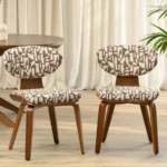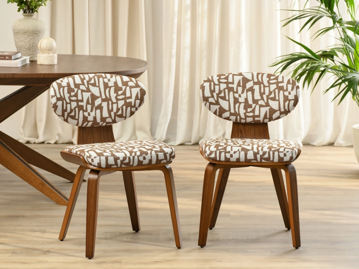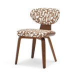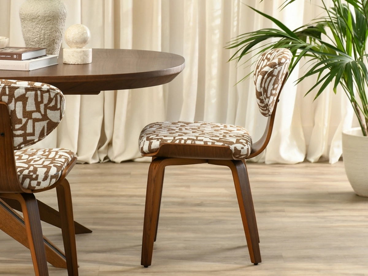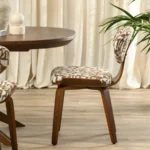 Blagovaonska stolica Saami elegantna je stolica inspirirana vintage stilom. Upečatljiv geometrijski uzorak unijet će jedinstvenu atmosferu u vaš interijer, a ovalni naslon s ukrasnim šavovima naglašava finoću izrade.
