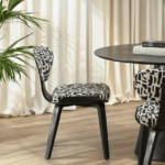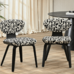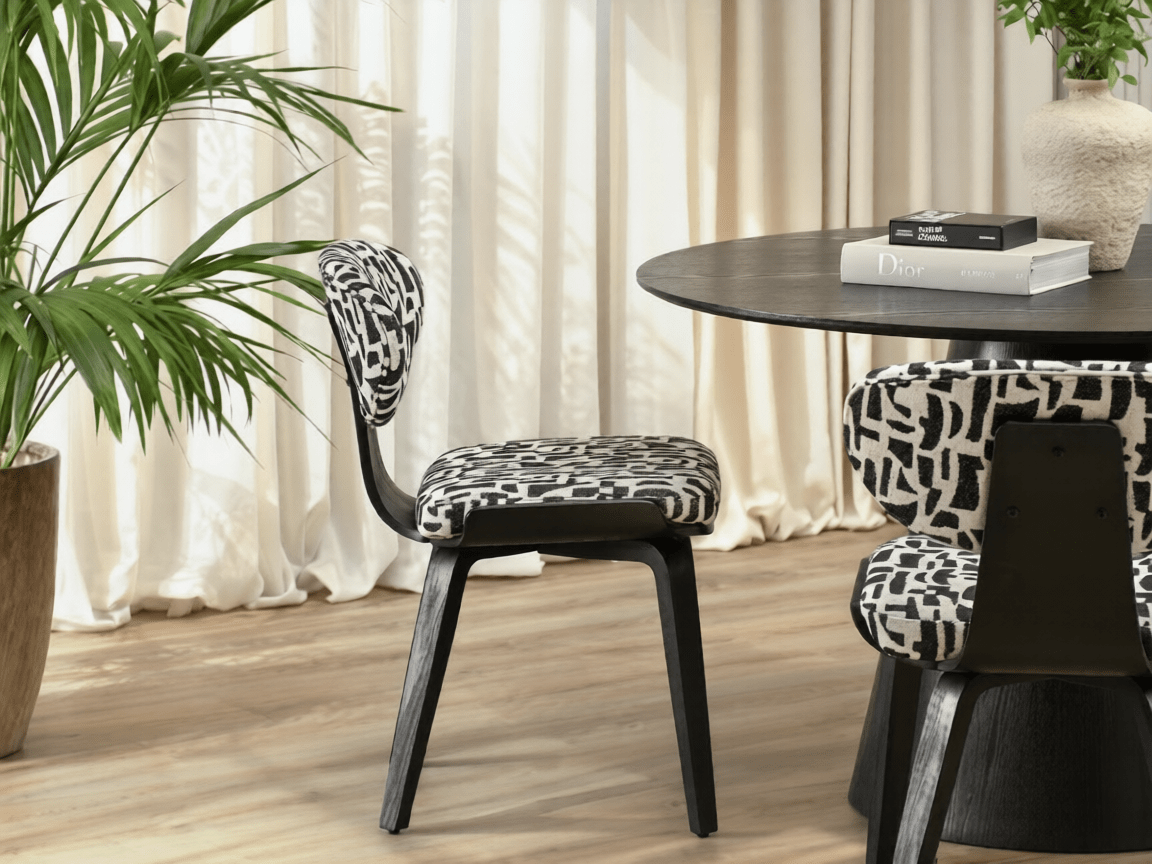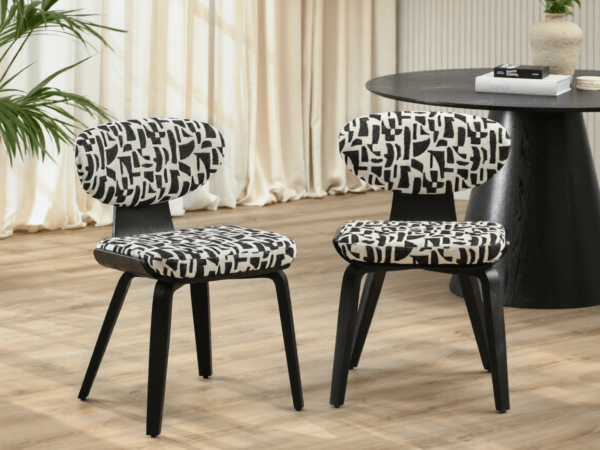 Blagovaonska stolica Saami elegantna je stolica inspirirana vintage stilom. Upečatljiv geometrijski uzorak unijet će jedinstvenu atmosferu u vaš interijer, a ovalni naslon s ukrasnim šavovima naglašava finoću izrade.
