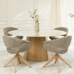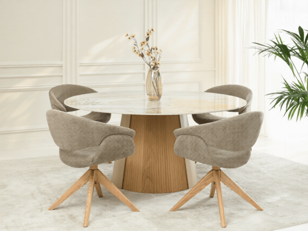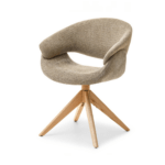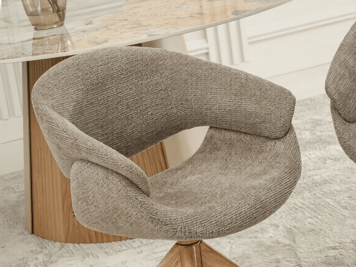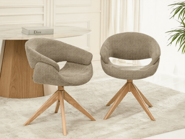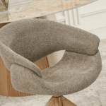Blagovaonska stolica Stieg utjelovljuje moderan stil s daškom prirodne topline drva. Njena svijetlosmeđa tkanina besprijekorno se uklapa u razne interijere, od minimalističkih do skandinavskih.