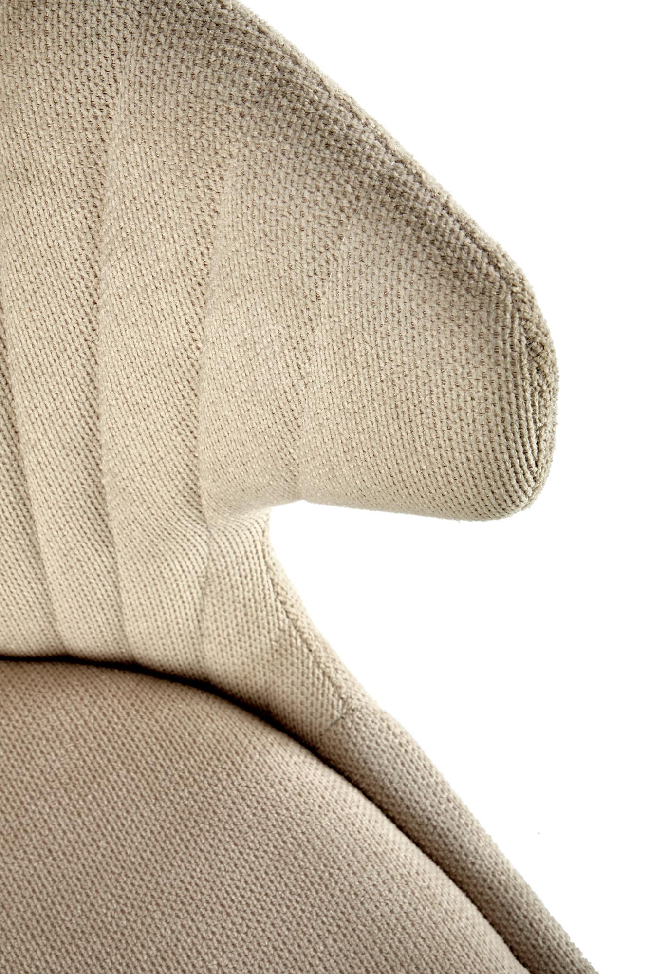 Stolica tapecirana tkaninom krupnoga tkanja s naslonom neobičnoga dizajna i metalnim nogama dostupna je u tri nijanse: beige, sivoj i oker.