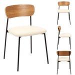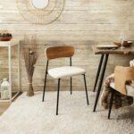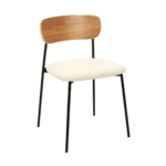 Blagovaonska stolica Ulla elegantan je model u vintage stilu čiji minimalistički oblik podsjeća na školske stolice. Stolica kombinira mekanu bouclé tkaninu, naslon od furnirane šperploče i crne metalne noge s praškastim premazom.
