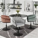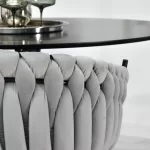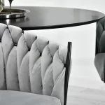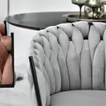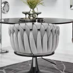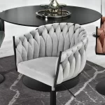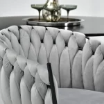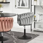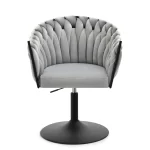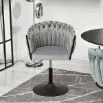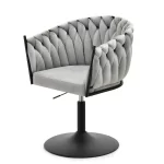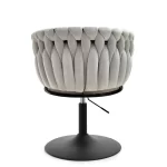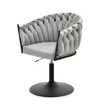 Okretna Zoe Ring uspješno će se uklopiti u interijere klubova, kafića i blagovaonica, a lijepo će izgledati i kao toaletni stolac ili stolac za garderobu. Materijal korišten za izradu fotelje je Magic Velvet u sivoj boji proizveden Cleanaboo tehnologijom. Zahvaljujući njoj, prolivena tekućina ne prodire u strukturu materijala već se formira u kapljice koje je dovoljno odmah ukloniti papirnatim ručnikom ili suhom krpom. Elegantno tijelo sjedala postavljeno je na nogu s okruglom stopom izrađenom od čelika premazanog prahom u crnoj boji. Stopa na svojoj donjoj strani ima plastični dodatak koji sprječava oštećivanje podloge, a montira se jednostavno – pomoću četiri vijka. Dubina sjedala, nasloni za ruke, mogućnost okretanja i regulacije visine omogućuju ugodno korištenje. Ručna izrada pletenica oko crnoga okvira oduševljava preciznošću tkanja te dodaje jedinstven karakter i ljepotu stolice gledane sa svih strana.