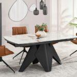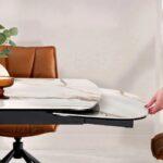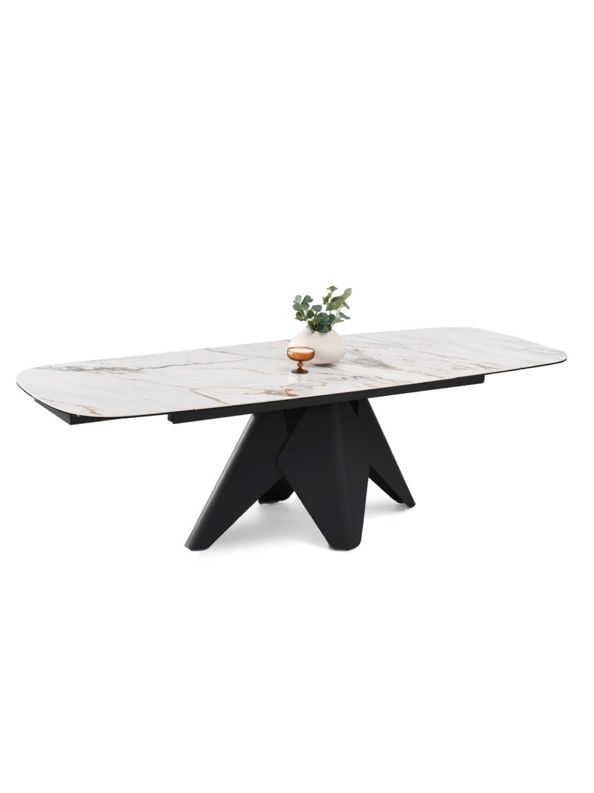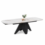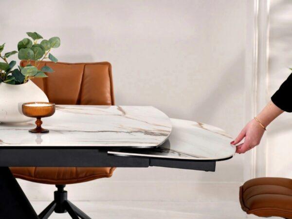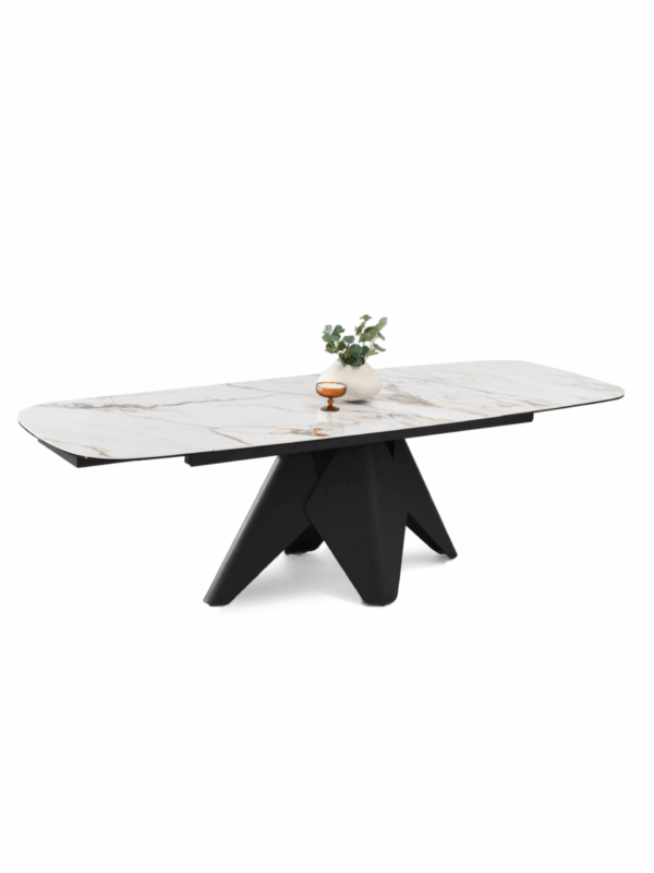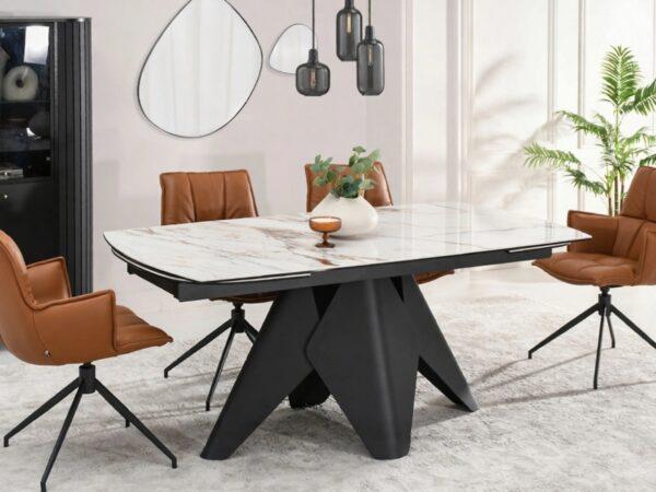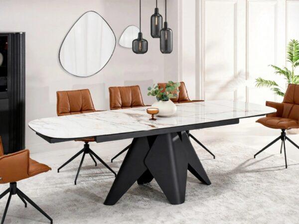 Blagovaonski stol Adler ističe se prije svega svojim praktičnim mehanizmom za izvlačenje koji omogućuje proširenje ploče stola do 260 cm, pružajući prostor za do 10 osoba. Ploča stola izrađena je od visokokvalitetne keramike s efektom Calacatta bež mramora, što osigurava iznimnu izdržljivost i otpornost na ogrebotine, a jedinstvena crna metalna baza jamči stabilnost i čvrstoću. Precizna izrada i pažnja prema detaljima čine Adler komadom namještaja koji će trajati godinama, zadržavajući svoj šarm čak i uz intenzivnu upotrebu.