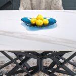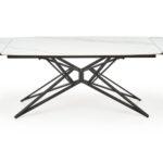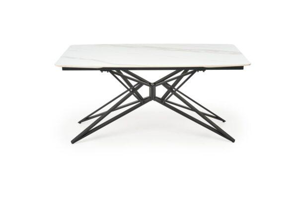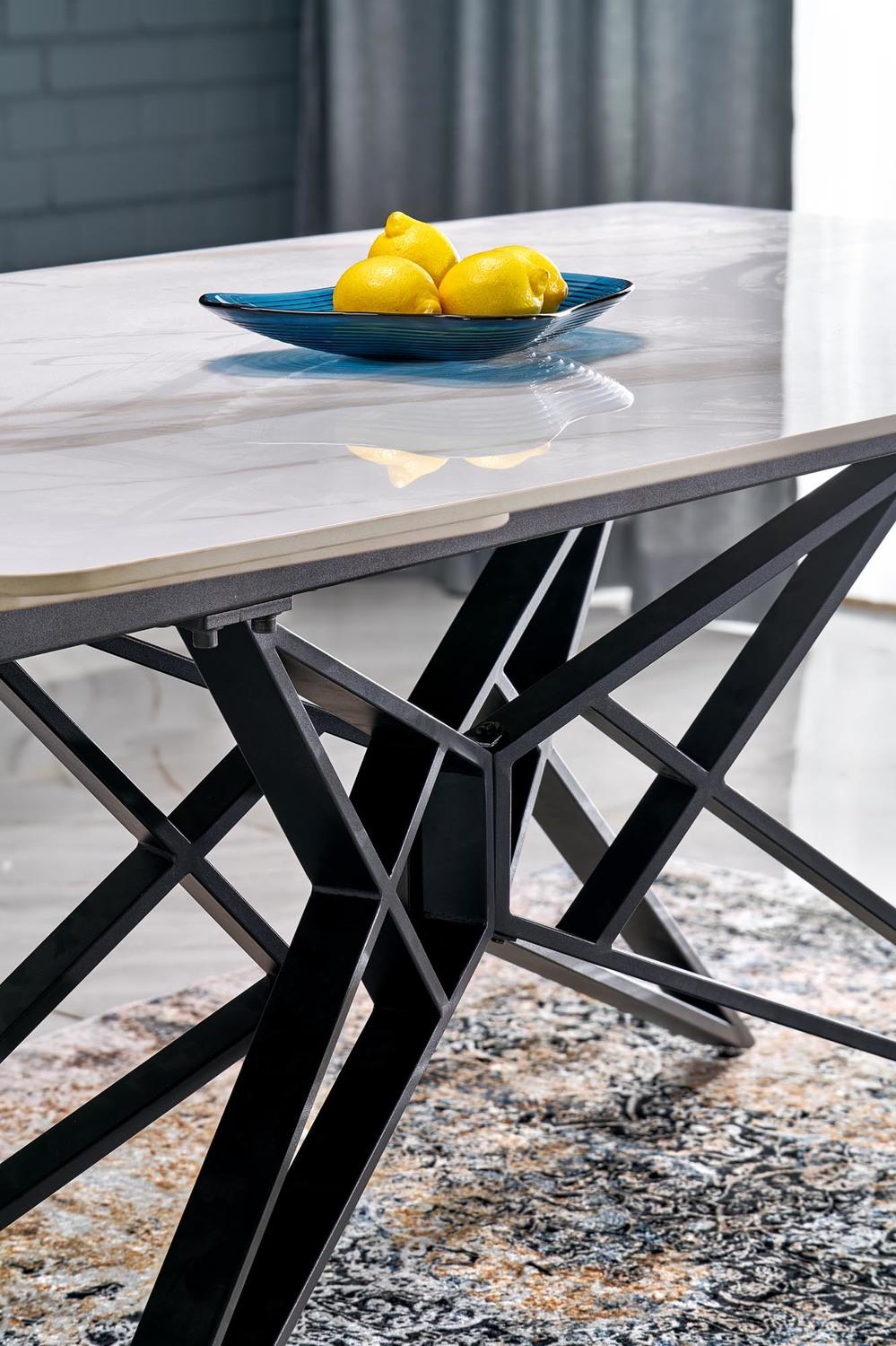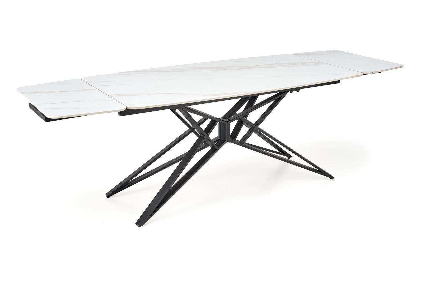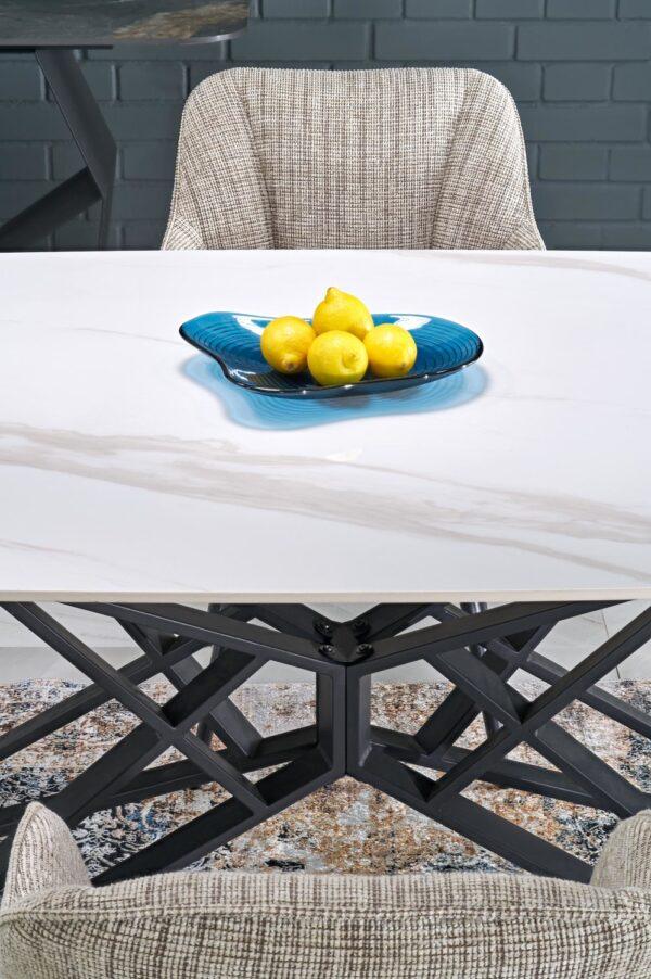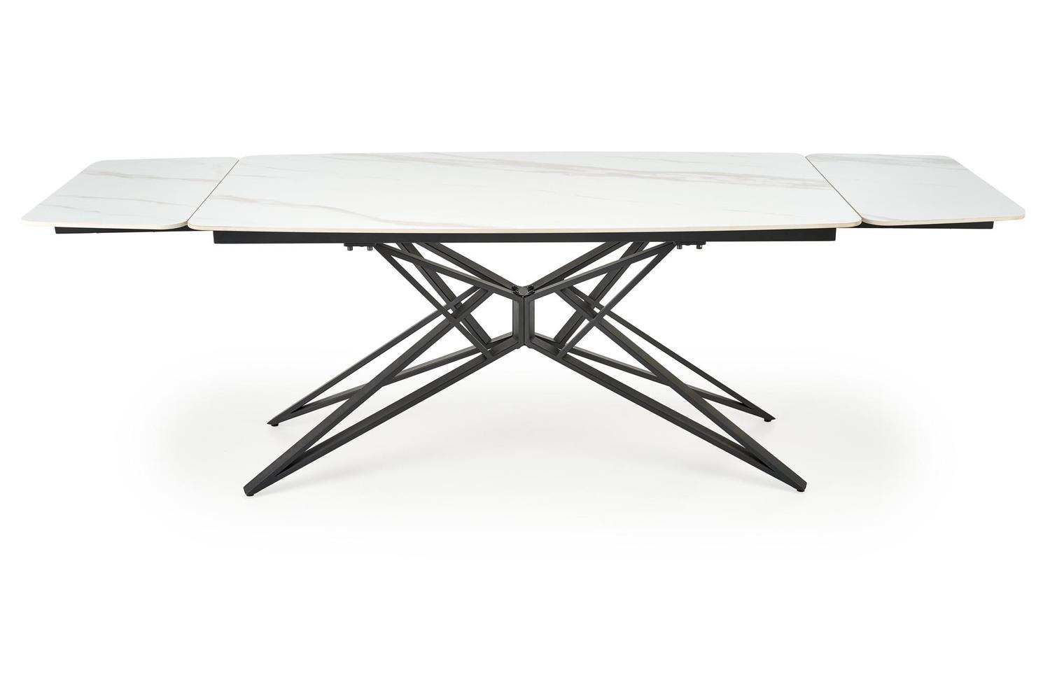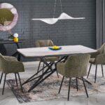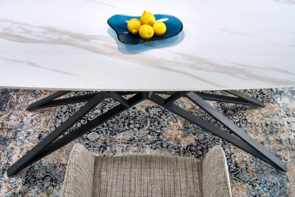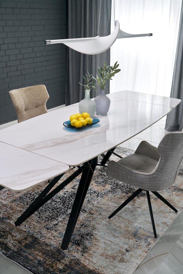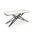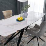 Alfred stol modernog je dizajna s funkcijom razvlačenja koja omogućuje prilagodbu većem broju gostiju. Sinterirana ploča u bijelom mramornom efektu osigurava izdržljivost i lako održavanje, dok crna čelična noga s praškastim premazom pruža stabilnost i elegantan kontrast. Idealno rješenje za suvremene i klasične interijere.