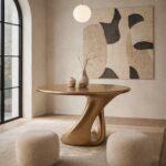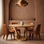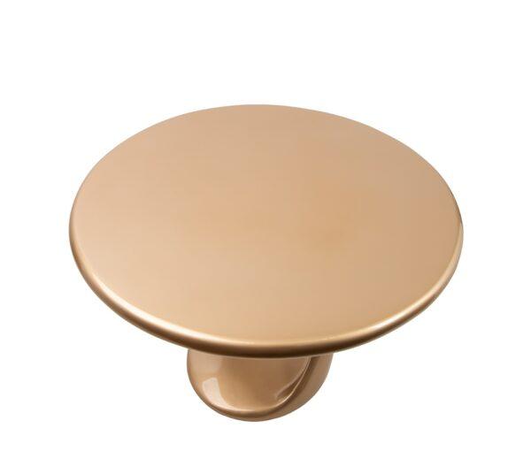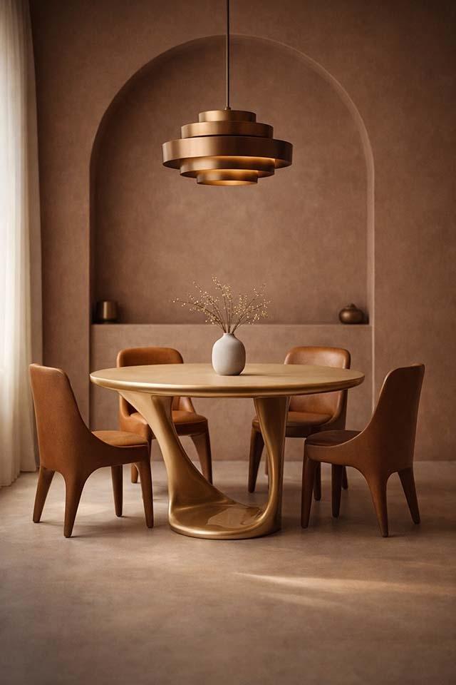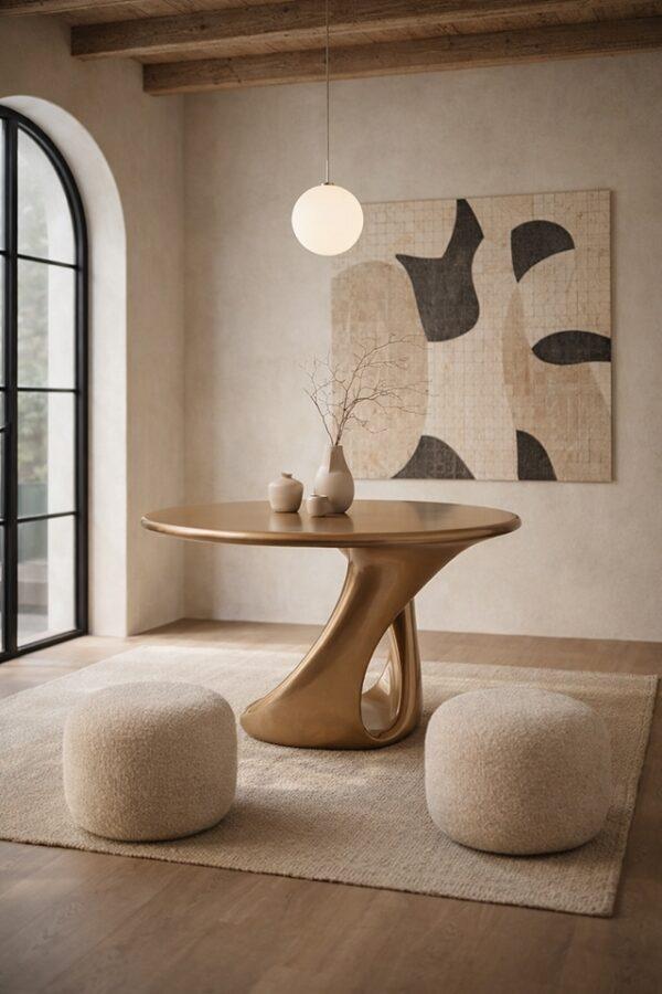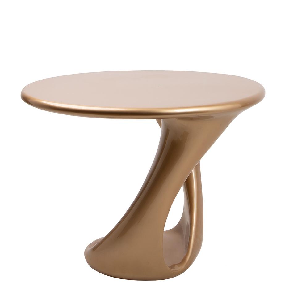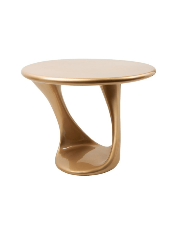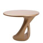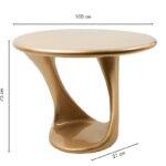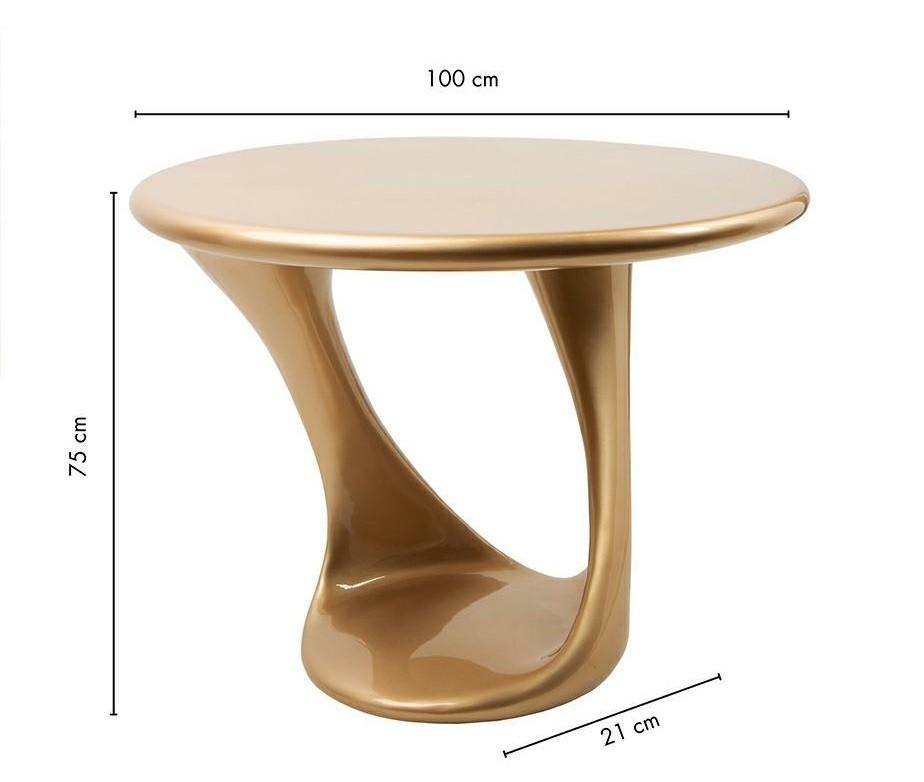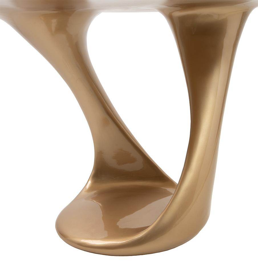 Izrađen od resina, blagovaonski stol Angelo očarava svojim fluidnim linijama. Okrugla ploča stola skladno nadopunjuje valovitu strukturu, dajući modelu lagan osjećaj unatoč čvrstom obliku. Blistava zlatna površina prekrasno reflektira svjetlost i unijet će dašak glamura u interijer.