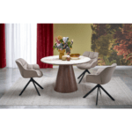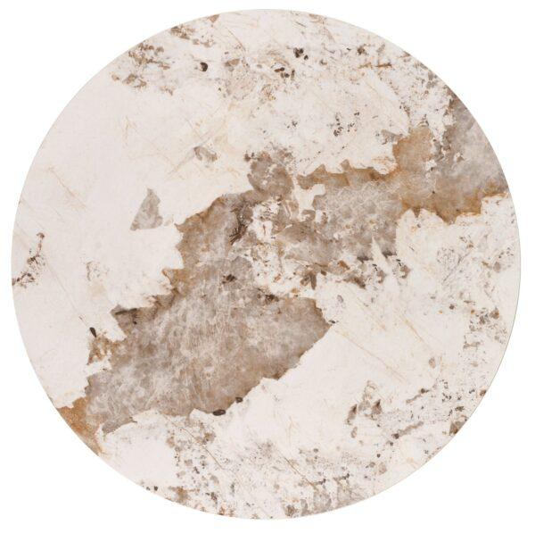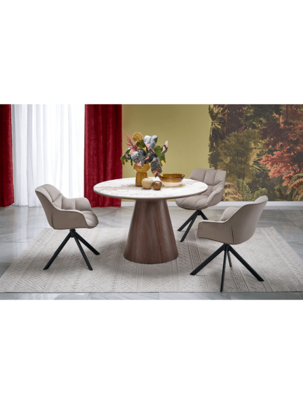 Okrugli stol Calina s prepoznatljivim oblikom “gljive” moderan je komad namještaja koji kombinira prepoznatljiv dizajn s funkcionalnošću. Bež mramorna radna ploča od sinteriranog mramora ima elegantan dizajn inspiriran prirodnim kamenom. Topli ton drva dodaje ugodan dodir interijeru i pruža elegantan kontrast svijetloj mramornoj ploči.