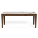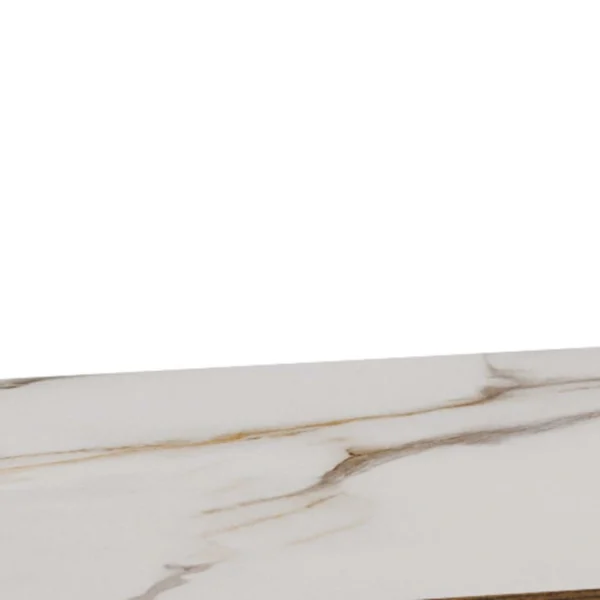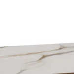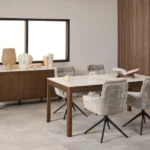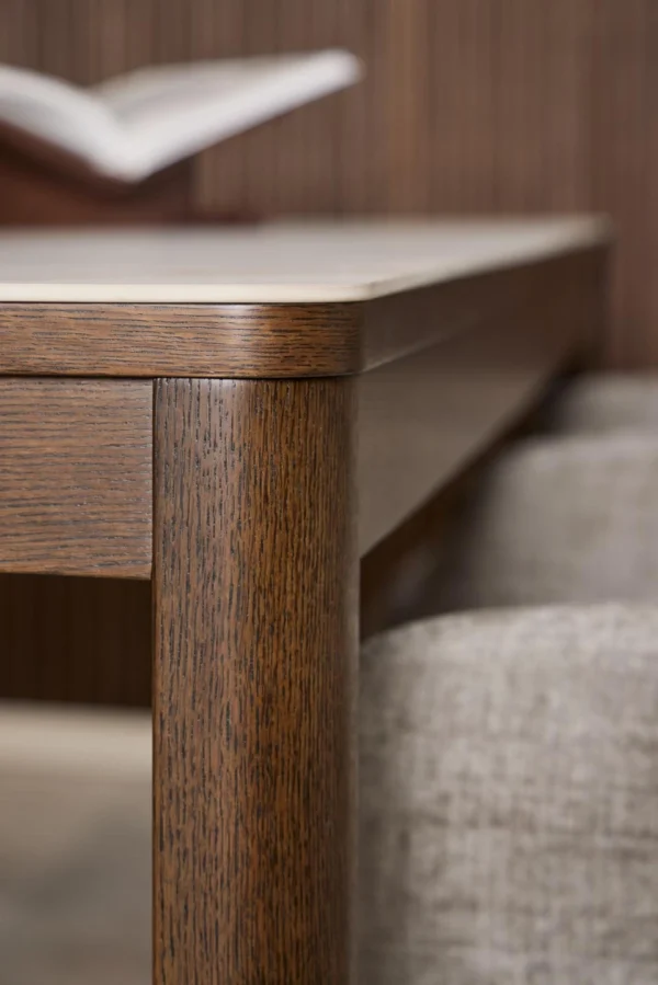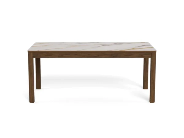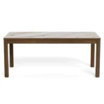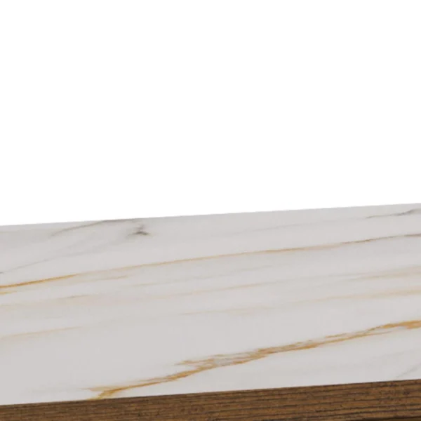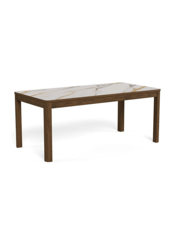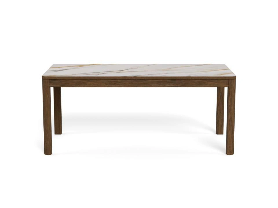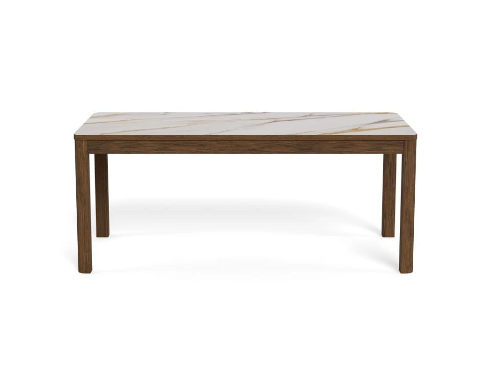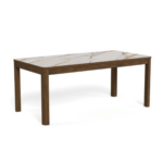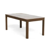 Blagovaonski stol Chiara svojim će jednostavnim, ali elegantim dizajnom upotpuniti blagovaonice s drvenim elementima. Furnirano postolje u boji tamnog hrasta skladno nadopunjuje keramičku ploču sa smeđim venama, dajući prostoru toplinu.