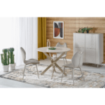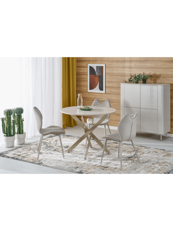 Moderan blagovaonski stol jednostavnog dizajna izrađen je od furniranog MDF-a s melaminskom završnom obradom u elegantnoj cashmere nijansi. Stabilna baza od čelika s praškastim premazom osigurava čvrstoću i dugotrajnost, dok kompaktne dimenzije čine stol idealnim za manje blagovaonice ili kuhinjske prostore.