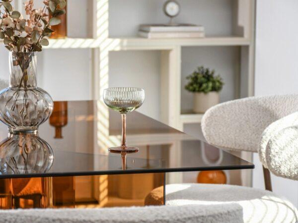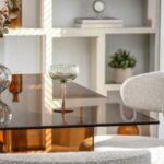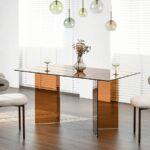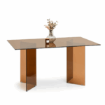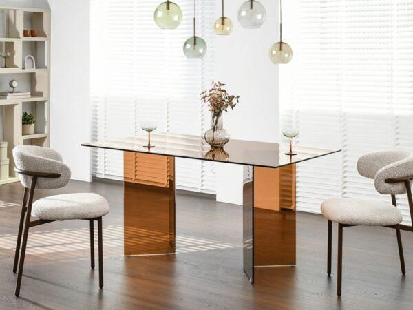Blagovaonski stol Etiel savršeno je rješenje za modernu blagovaonicu ili elegantan dnevni boravak gdje su elegancija i minimalizam ključni. Njegova staklena ploča u kombinaciji s poluprozirnim nogama u toploj konjak nijansi daje prostoru lagan i profinjen karakter.