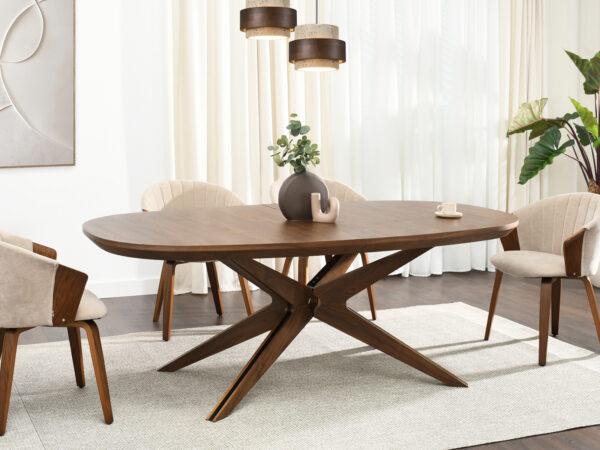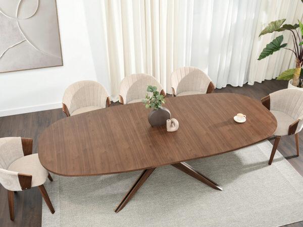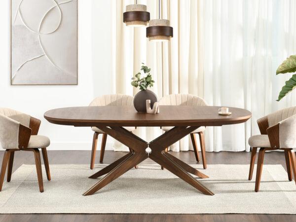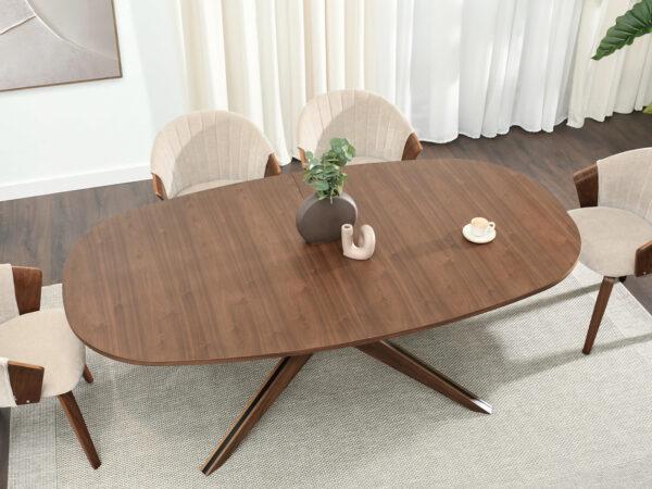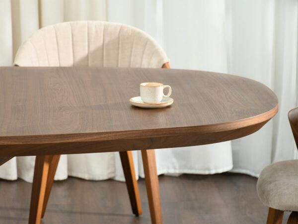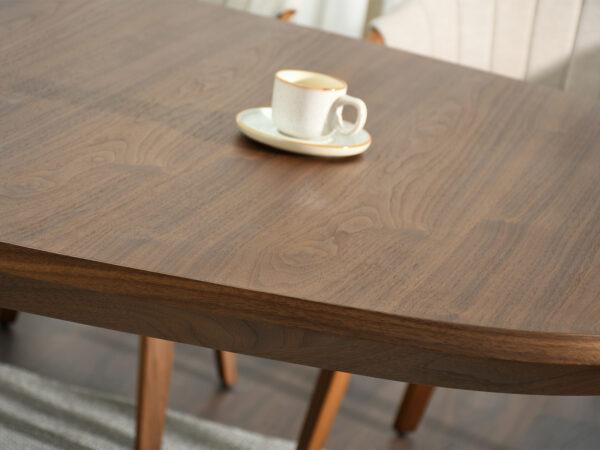 Blagovaonski stol Francesco inspiriran je skandinavskim stilom, s prirodnim materijalima u prvom planu. Površina je vrlo otporna na ogrebotine i oštećenja, što ovaj stol čini idealnim izborom za intenzivnu upotrebu. Baza je izrađena od punog drva, osiguravajući trajnost i čvrstoću. Četiri geometrijski oblikovane noge spajaju se u središnjoj točki ispod ploče stola i stvaraju učinkovitu, stabilnu bazu.