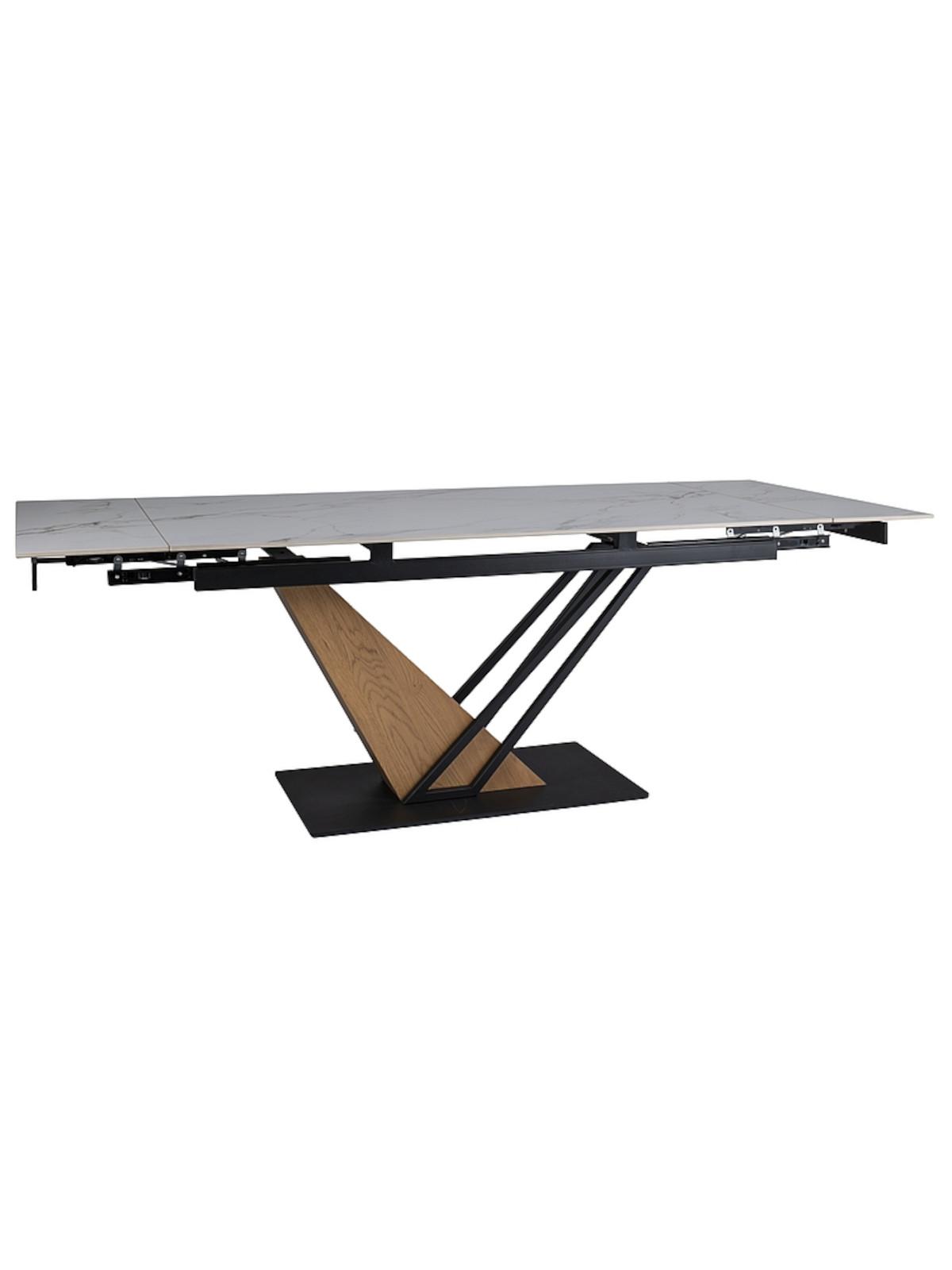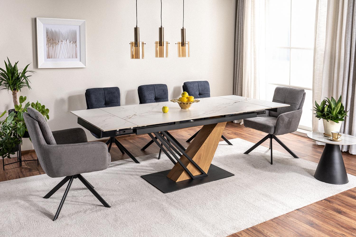 Blagovaonski stol Gomez izrađen je od keramičke ploče u imitaciji mramora i postolja koje je kombinacija MDF-a i metala. Stol Gomez je dimenzija 160×90 cm, a moguće ga je razvući do 220 cm. Postolje neobičnog dizajna bit će naglasak u prostoru, a dodatak drveta stvorit će toplinu u Vašem interijeru.