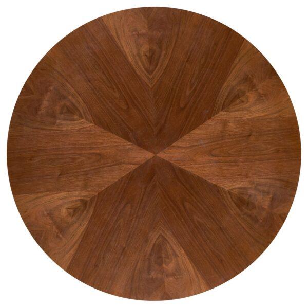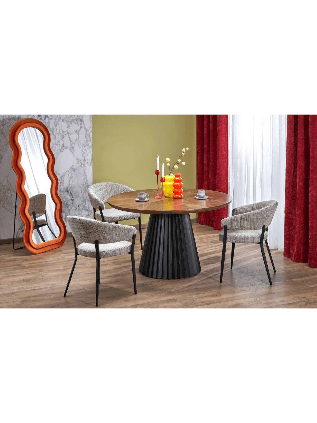 Stol Havenor s jedinstvenom harmonika nogom kombinira dizajn i funkcionalnost. Ploča stola, izrađena od MDF-a s prirodnim furnirom u toploj boji oraha, ukrašena je intarzijom, što površini daje jedinstven karakter i eleganciju. Ovaj stol kombinira moderan oblik, izdržljive materijale i dekorativne detalje.