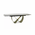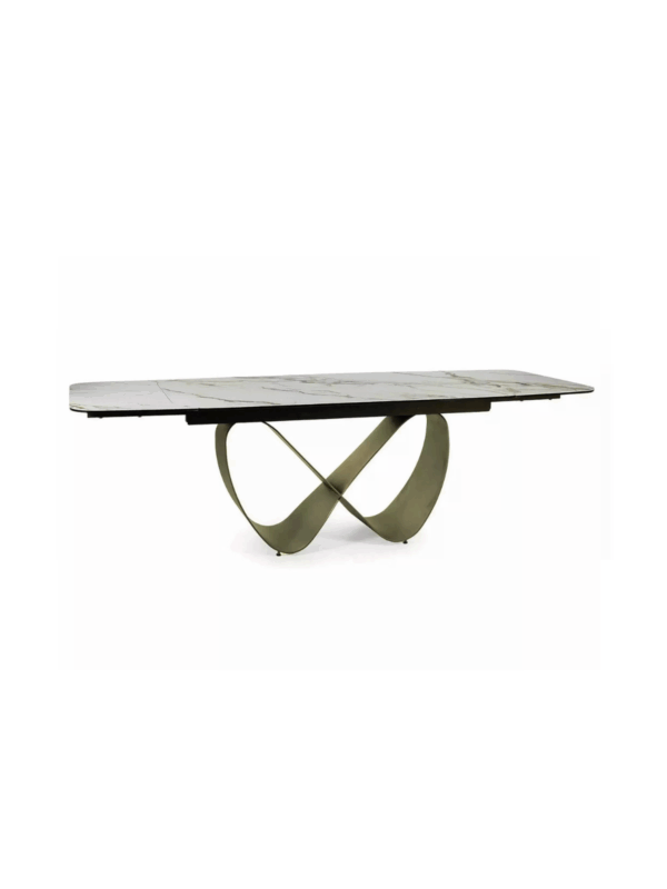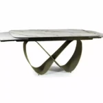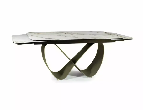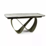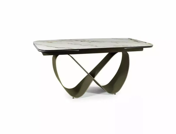 Keramički stol Infy ovog puta u kombinaciji s bijelom keramičkom pločom u imitaciji mramora i metalnim smeđim postoljem bit će odličan izbor za sve ljubitelje modernih, ali elegantnih interijera. Stol Infy je dimenzija 160 x 95 s mogućnošću razvlačenja do 240 cm. Dvoslojna ploča od kaljenog stakla i španjolske keramike osigurava dodatnu čvrstoću, a metalne noge neobičnih zaobljenih linija u prostoru će biti poseban detalj.