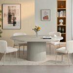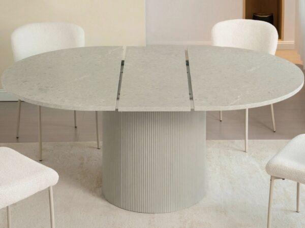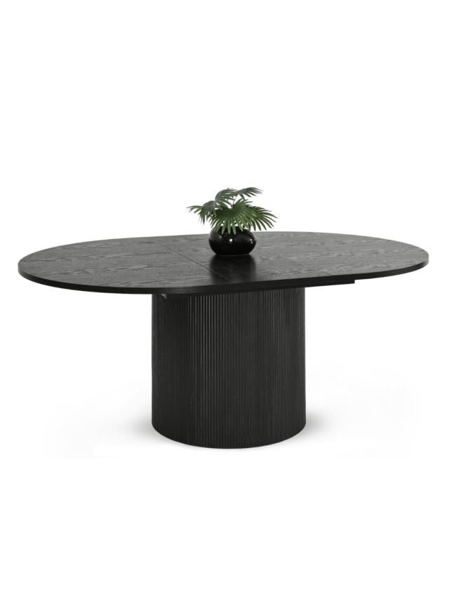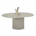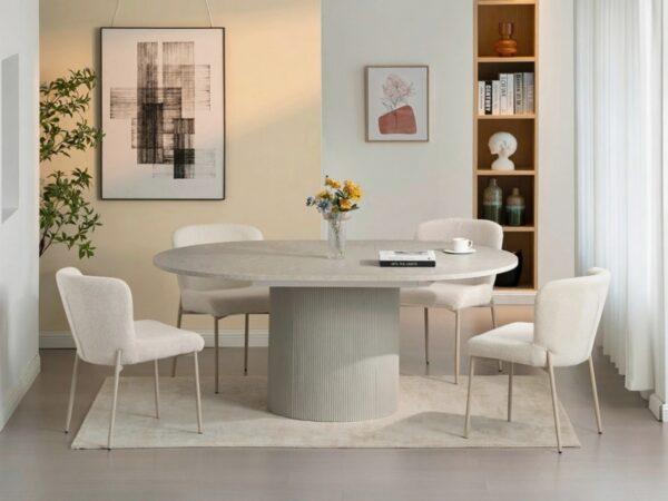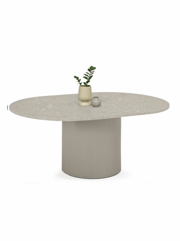 Ovalni blagovaonski stol Krista s pločom strukturiranom drvetom i užljebljenom bazom izraz je moderne elegancije i iznimnog stila. Njegov jedinstveni oblik i vrh s izraženim vlaknima privlače pozornost, stvarajući profinjeni naglasak u svakom interijeru. Savršen kako za svakodnevne obroke tako i za svečanije prigode, donosi otmjenost i funkcionalnost u dom.