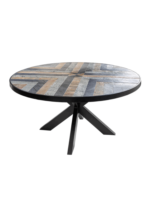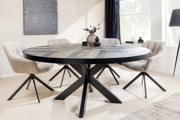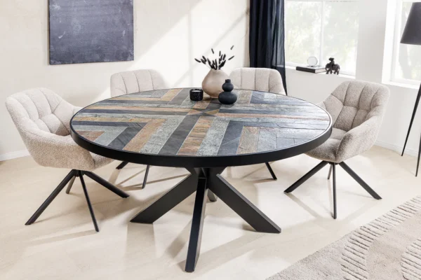 Blagovaonski stol Libera kombinira visokokvalitetne materijale s jedinstvenim dizajnom koji će obogatiti vašu blagovaonicu šarmom i stilom. Okrugla ploča stola izrađena od pravog furnira s izgledom prirodnog kamena stvara skladnu interakciju boja. Ploču stola podupire čvrsta crna baza, čije čiste linije dodaju industrijski dodir.