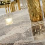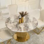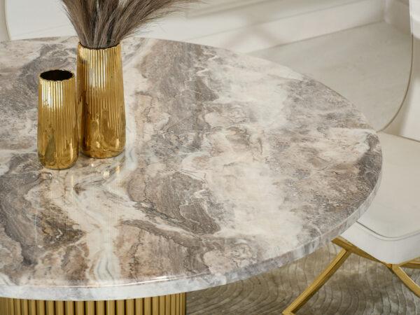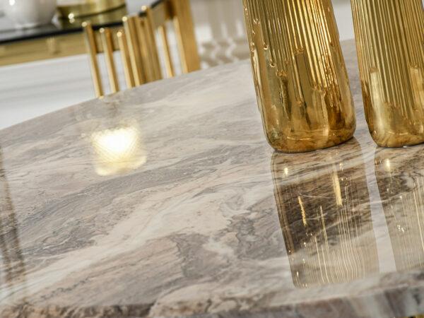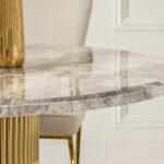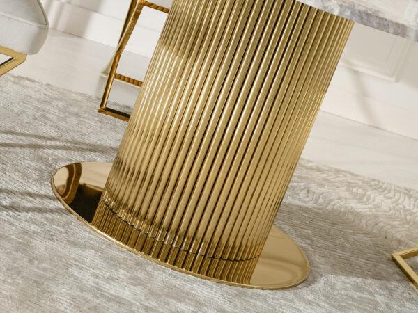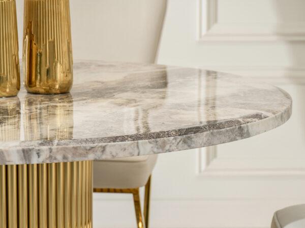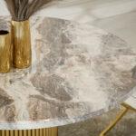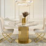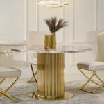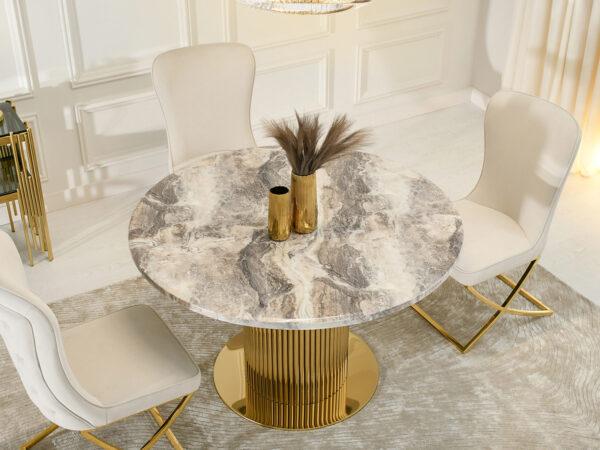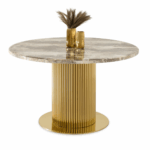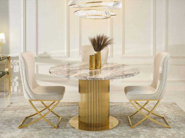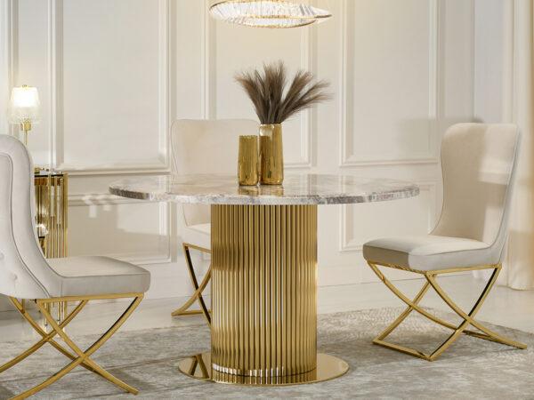 Blagovaonski stol Luxe je elegantan komad namještaja koji će se savršeno uklopiti i u dnevni boravak i u blagovaonicu. Njegova okrugla ploča s mramornom završnom obradom i zlatna baza daju luksuzan karakter interijeru i služe kao snažan naglasak.
